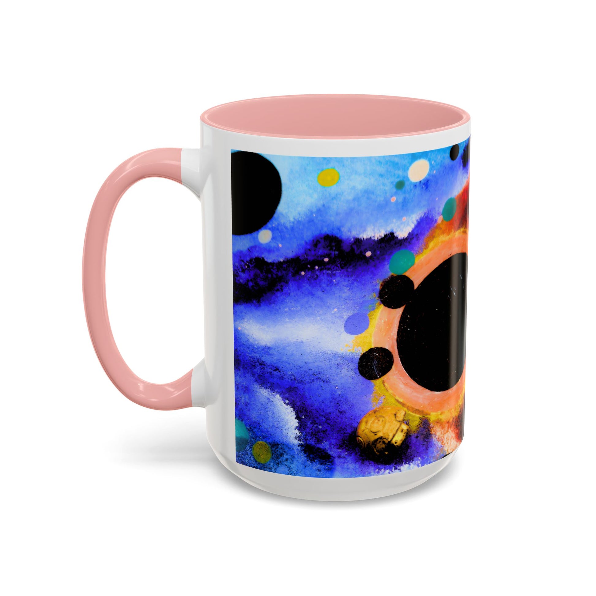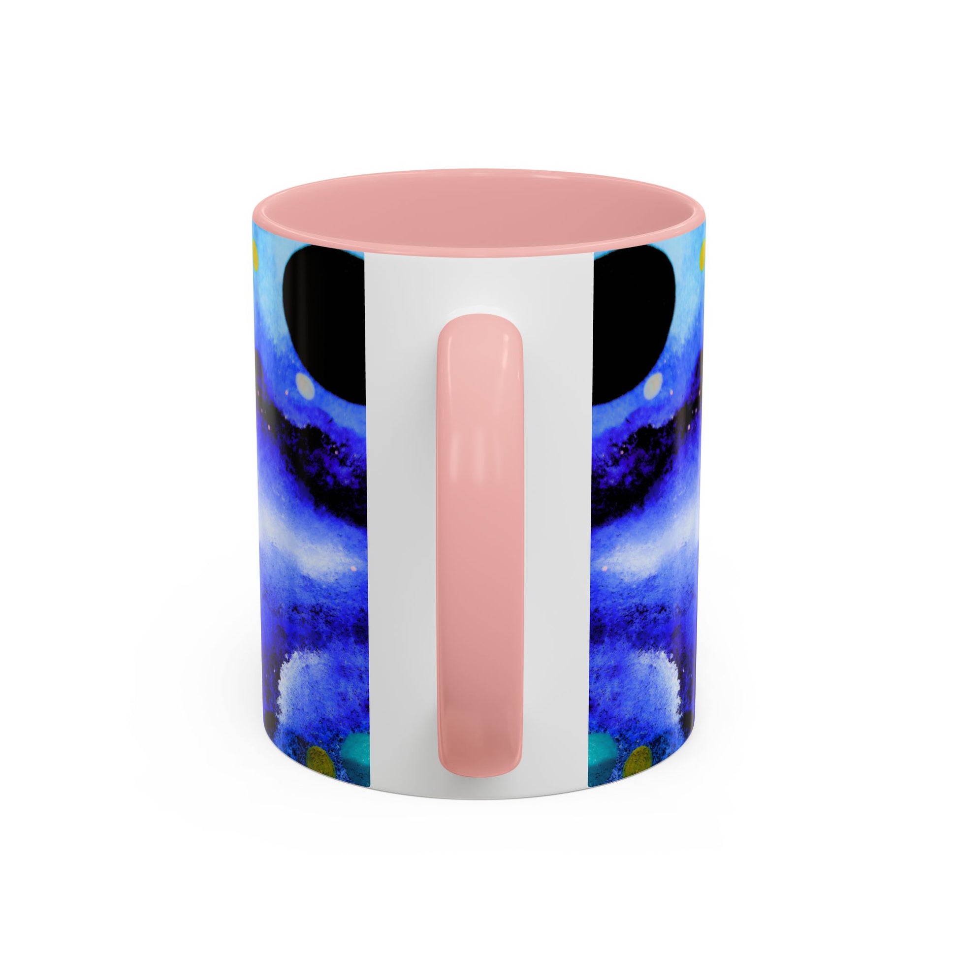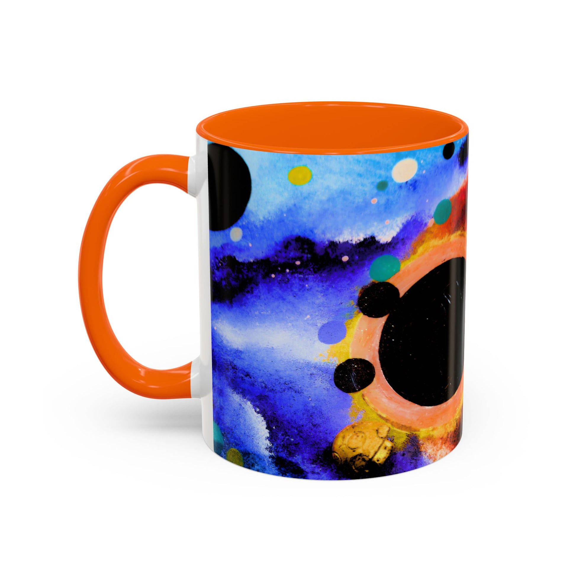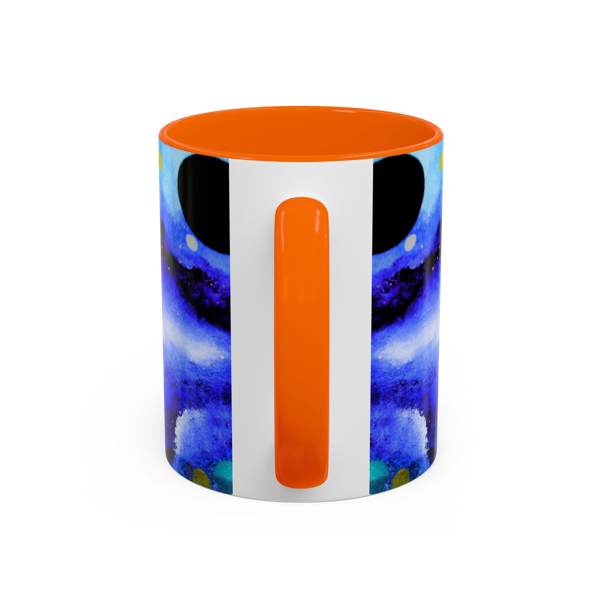 This vibrant ceramic mug brings painterly color and bold contrast to your morning ritual. Rich blues, warm oranges, and jewel-tone accents swirl around a striking black central motif, creating an artful, almost-kaleidoscopic scene that reads like a small canvas. The colored interior and handle frame the design, making each sip feel curated and intentional. Hand it to a friend who collects bright, modern art or keep it on your desk as a miniature statement piece that wakes up both your drink and your mood.