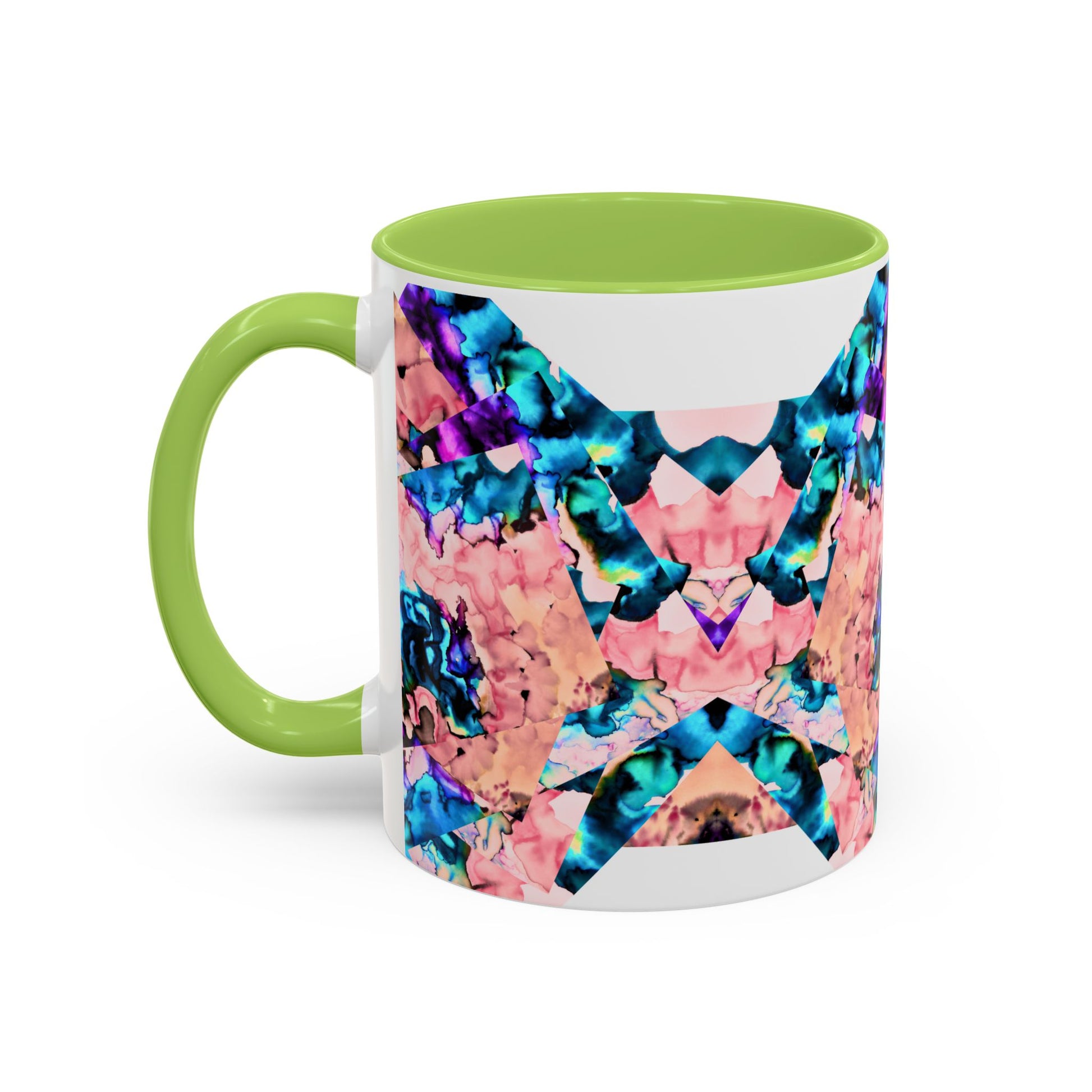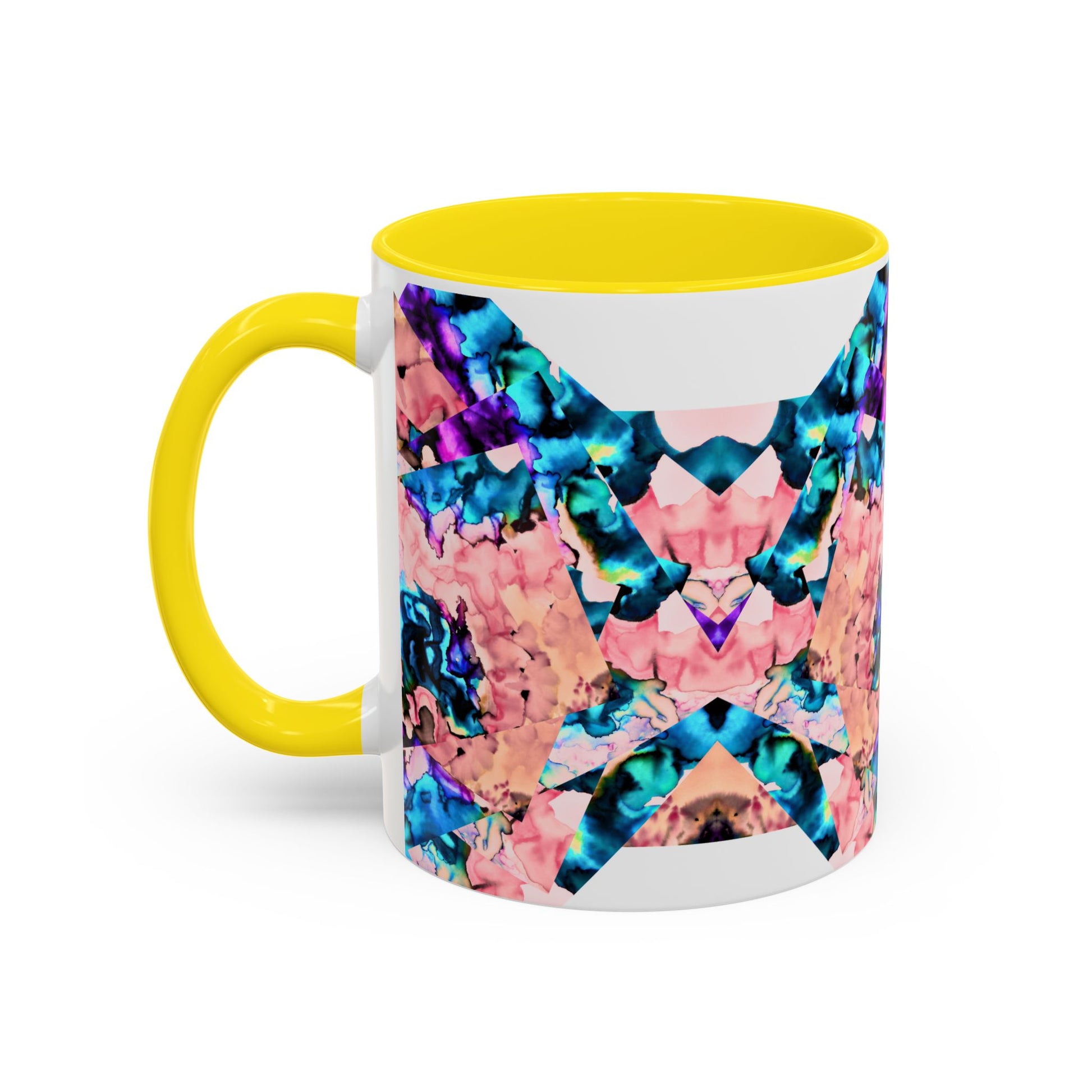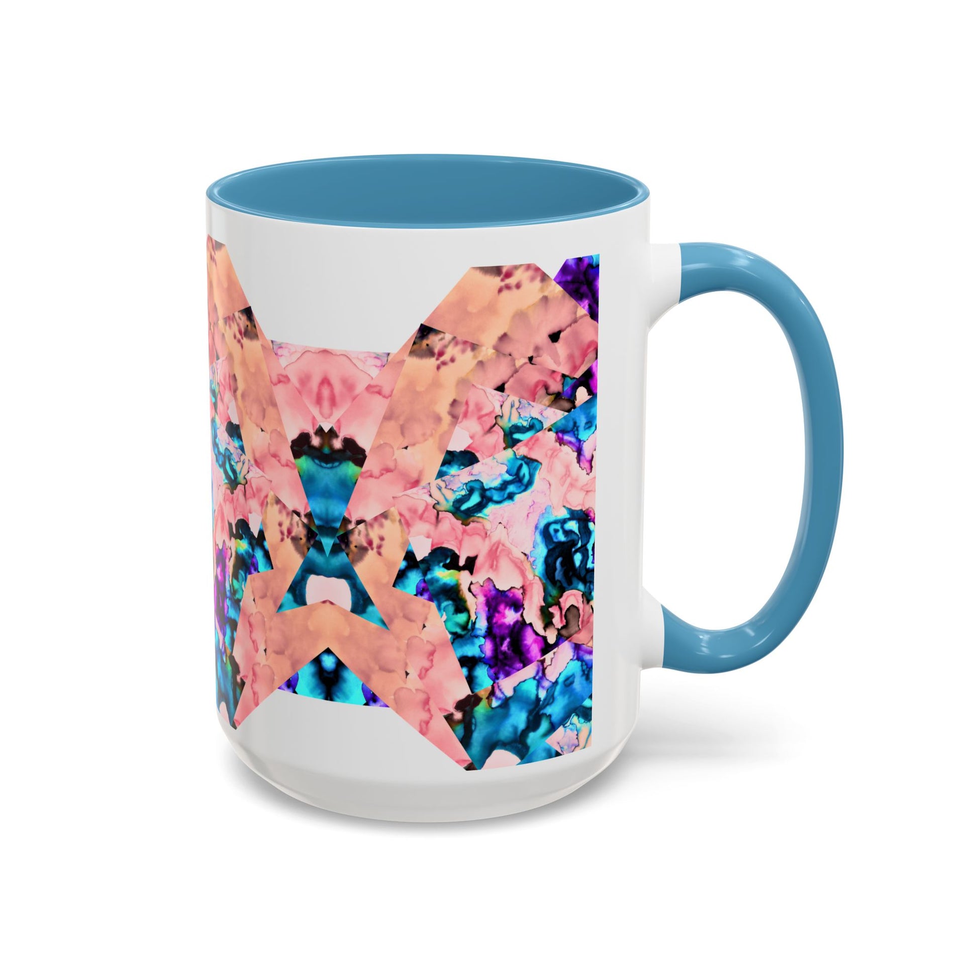 Bright, artful ceramic mug that brings a splash of color to slow mornings and creative breaks. The glossy white body contrasts with a bold, mirrored pattern in coral, teal and violet that looks hand-painted — like a small kaleidoscope on your counter. The colored interior and C-handle add personality while keeping everyday use easy: heat drinks in the microwave, and pop it in the dishwasher without losing vibrancy. Use the larger 15 oz size for long studio sessions or the compact 11 oz for a quick espresso. Lead- and BPA-free for worry-free sipping.