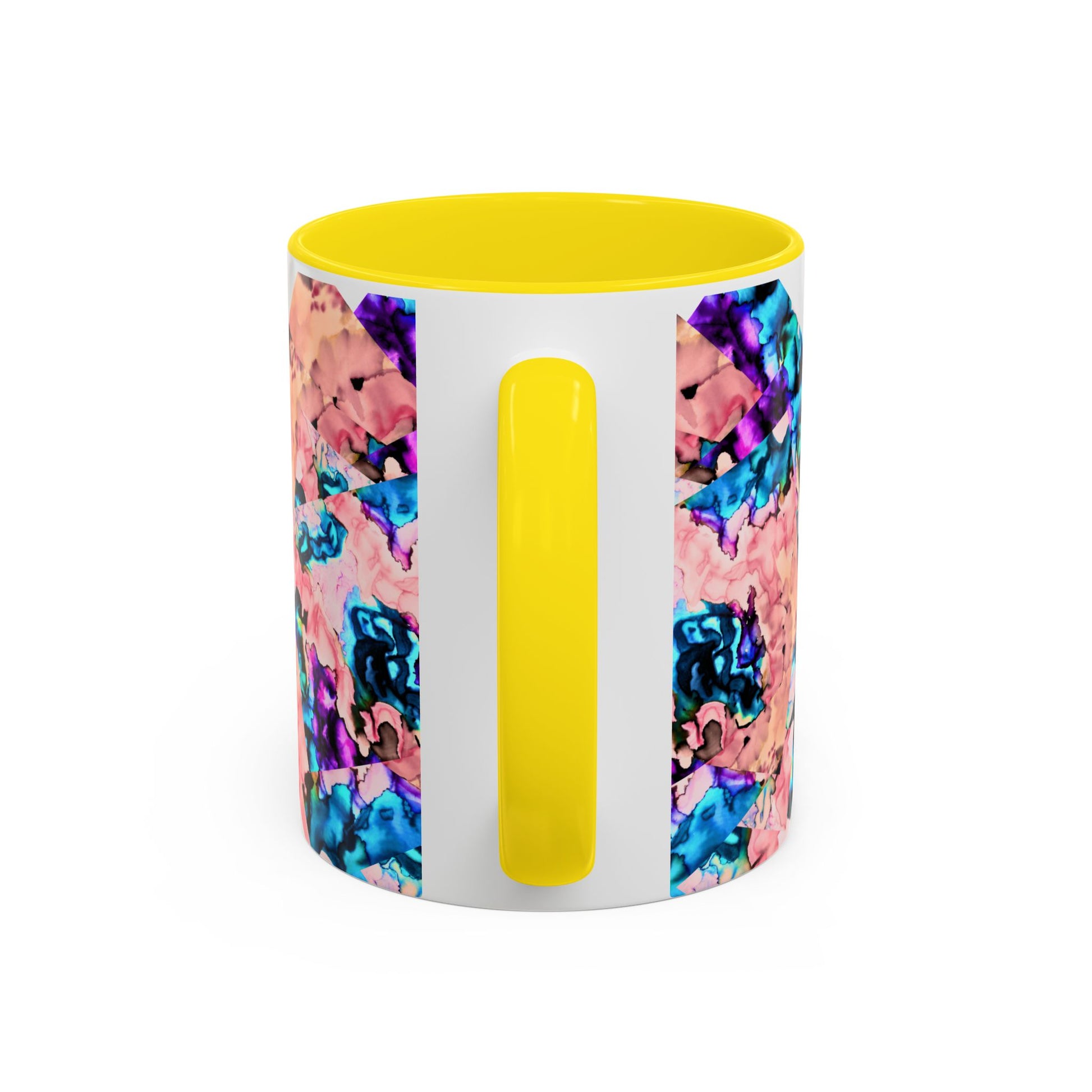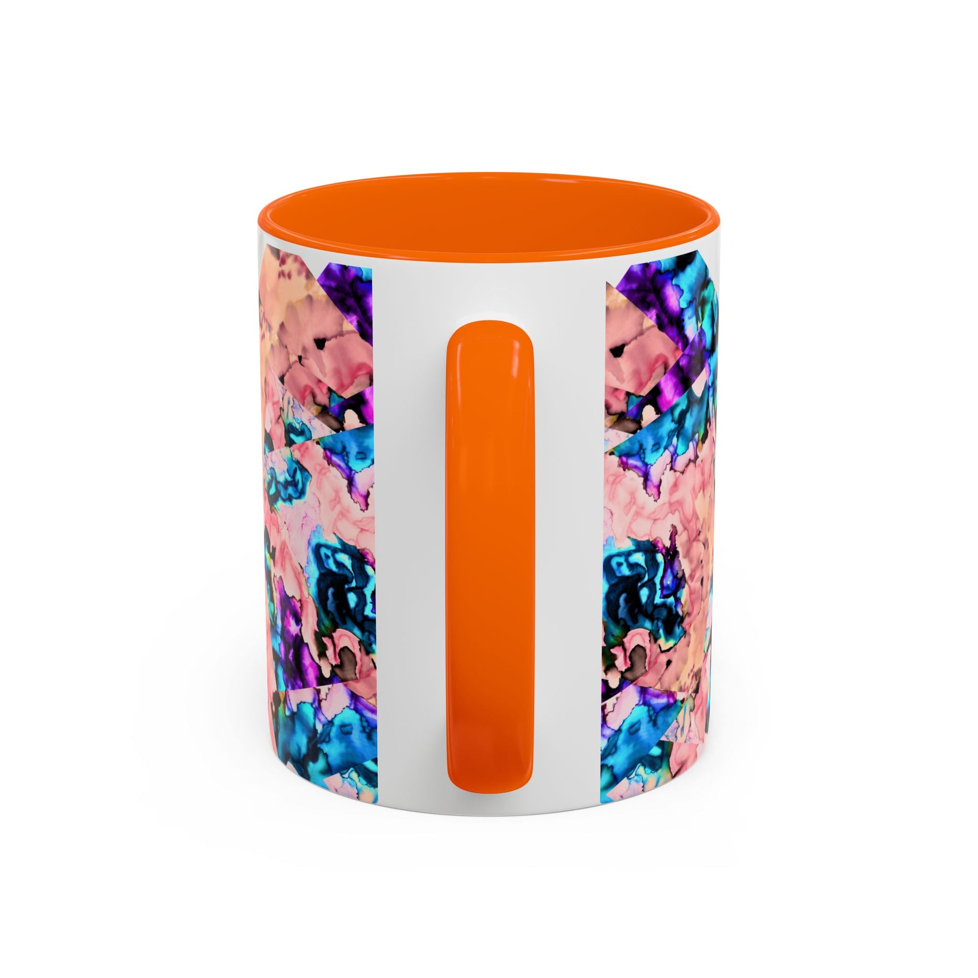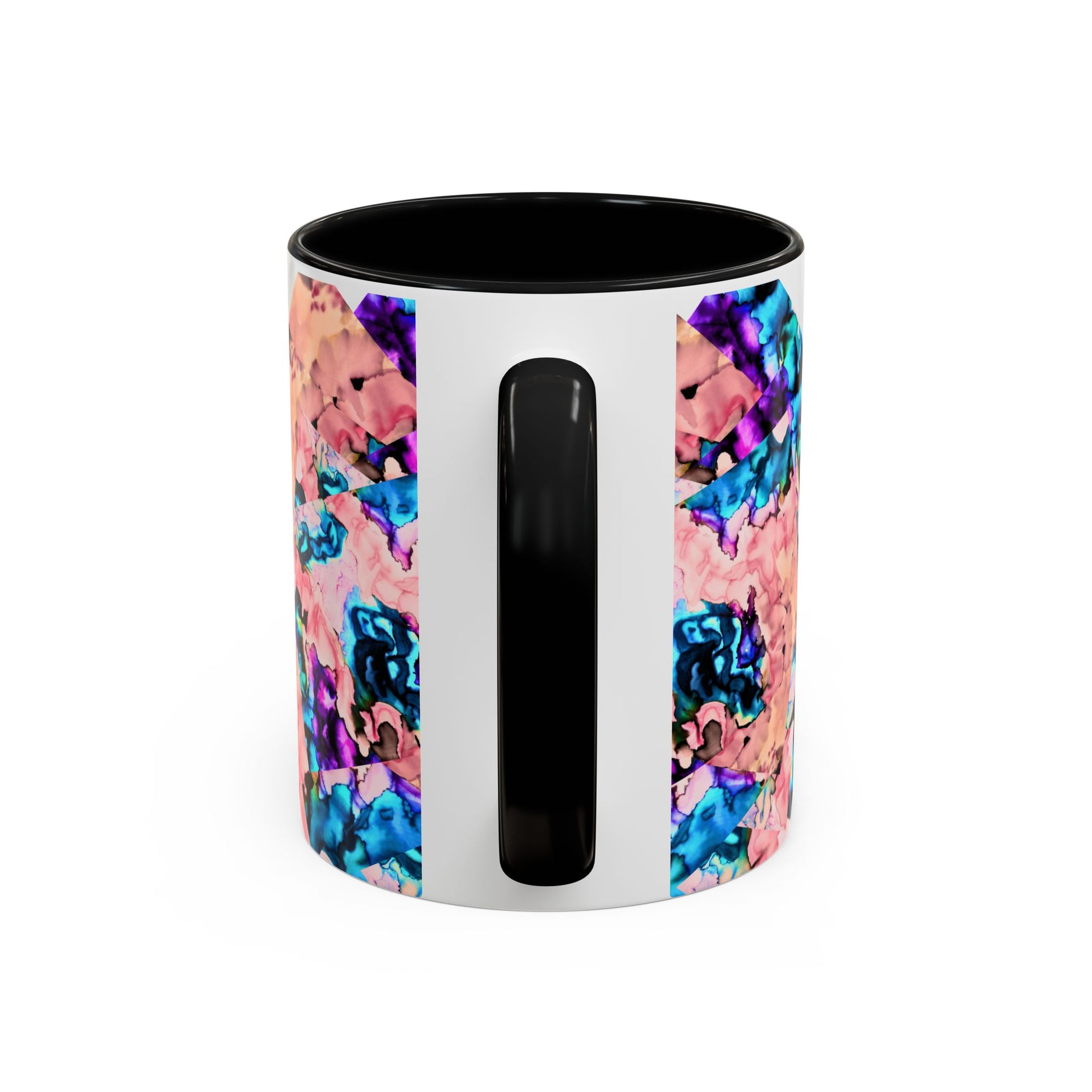 Bright, artful ceramic mug that brings a splash of color to slow mornings and creative breaks. The glossy white body contrasts with a bold, mirrored pattern in coral, teal and violet that looks hand-painted — like a small kaleidoscope on your counter. The colored interior and C-handle add personality while keeping everyday use easy: heat drinks in the microwave, and pop it in the dishwasher without losing vibrancy. Use the larger 15 oz size for long studio sessions or the compact 11 oz for a quick espresso. Lead- and BPA-free for worry-free sipping.