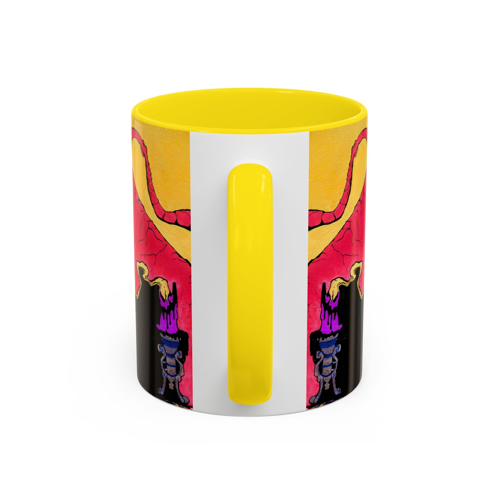 A vibrant ceramic mug that brings bold, graphic energy to your morning ritual. Rich contrasting colors wrap around the cup, pairing a glossy black interior and handle with a punchy yellow rim and dynamic red-and-white artwork. The design reads like a miniature poster — edgy, slightly surreal, and full of motion — so this mug becomes a small statement piece on your desk or kitchen counter. It holds your coffee or tea while reflecting a taste for art that’s loud, imaginative, and unapologetic. Warm beverages taste a little brighter in something that looks this alive.