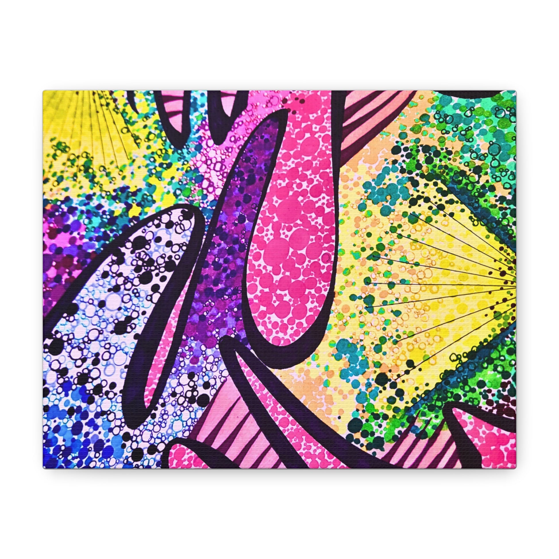 Bright, energetic, and unapologetically bold — this stretched matte canvas brings a splash of street-art vibrancy to any wall. Painted with vivid fuchsia, electric yellow, teal and cobalt speckles, the abstract composition feels like a captured moment of graffiti in motion. The 1.25" depth gives it gallery weight while the matte finish mutes glare so the textured details read beautifully from every angle. Lightweight and ready-to-hang, it fits naturally above a desk, in a creative studio, or as a focal piece in a living room that celebrates color and playful chaos. The natural pine stretcher and soft rubber feet protect surfaces and help the piece sit straight, while durable, eco-conscious inks keep the hues popping for years.