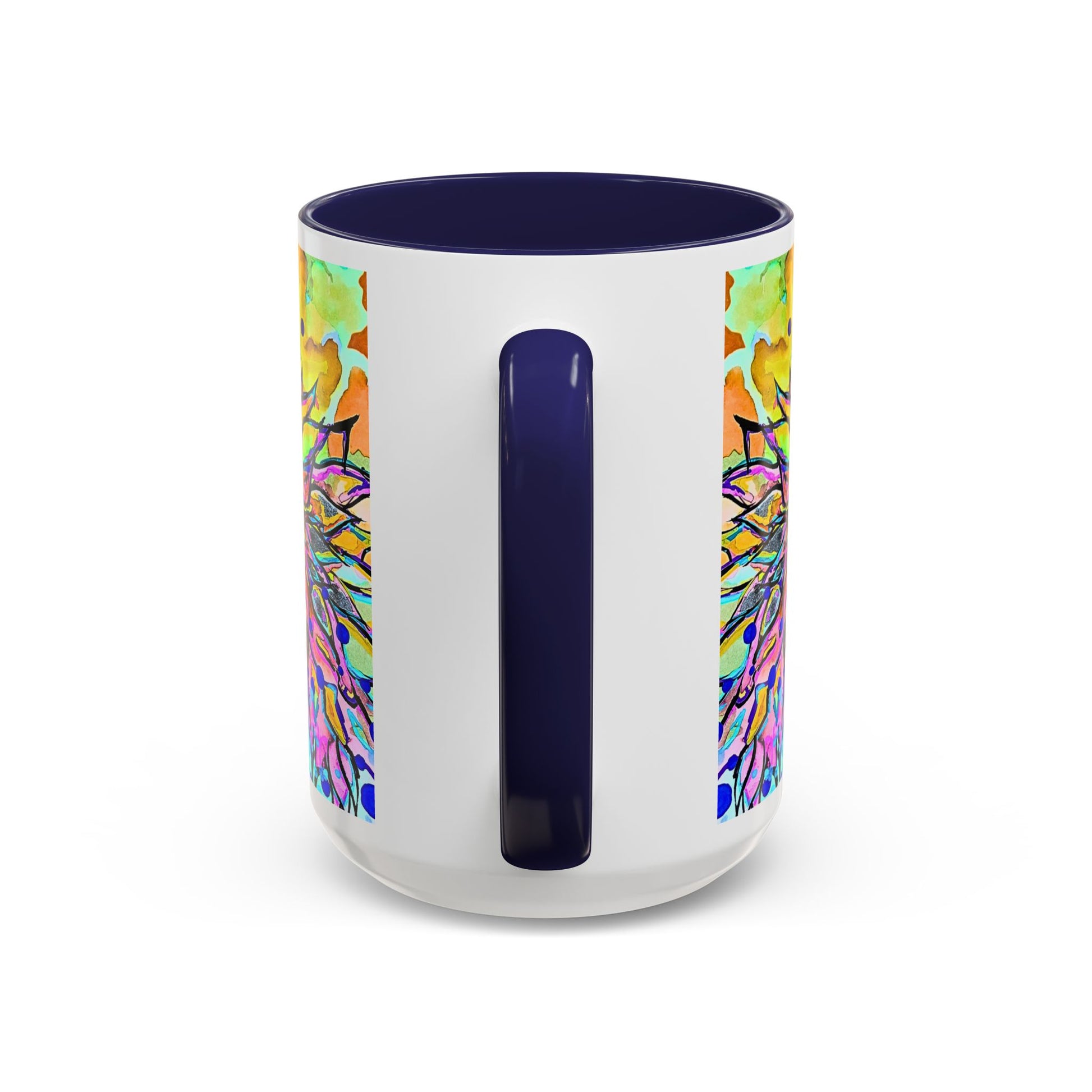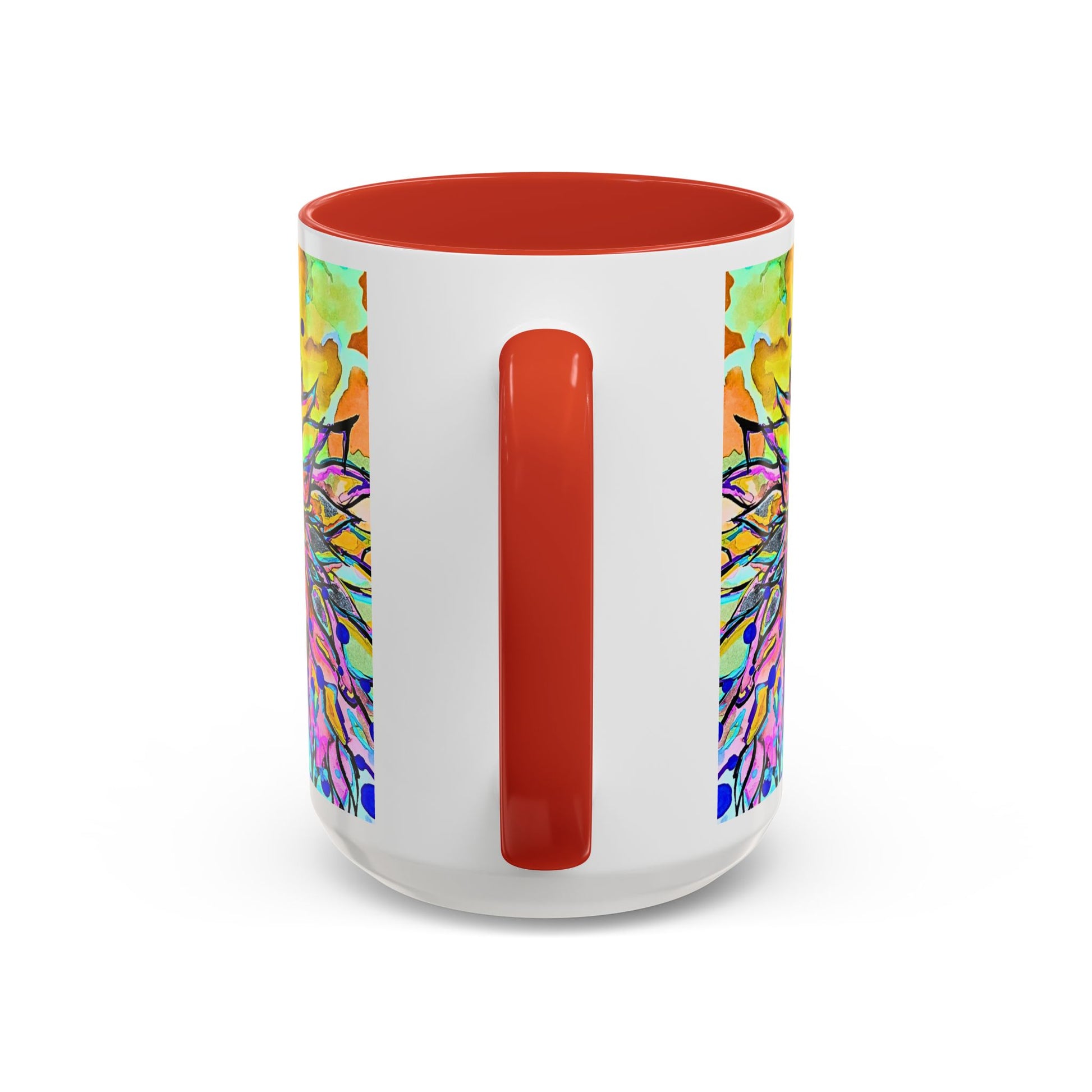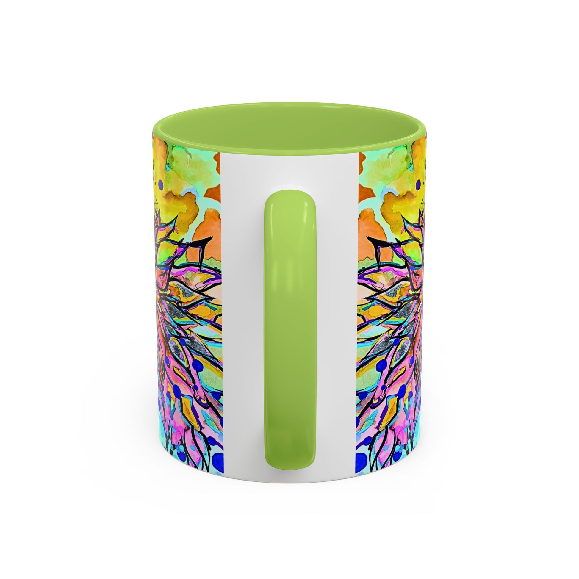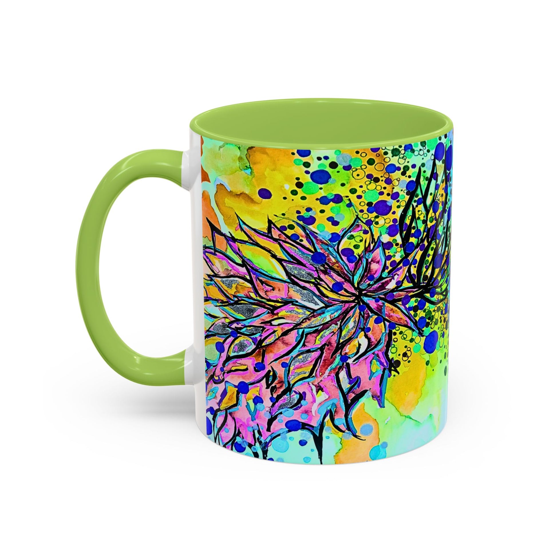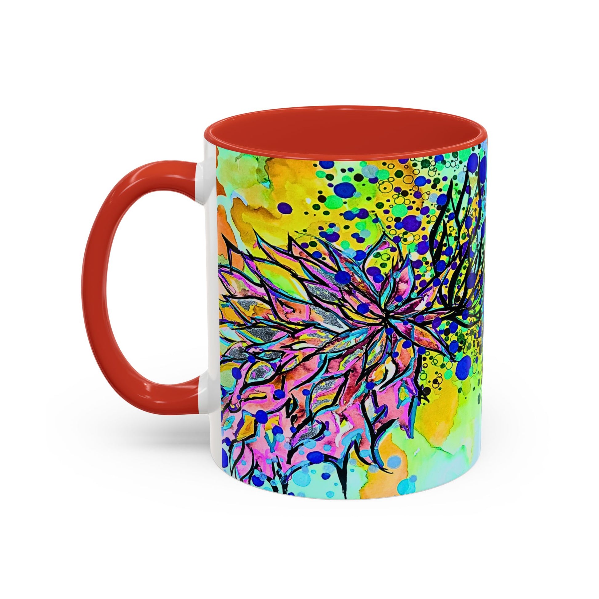 This ceramic mug brings a burst of color and playful energy to every sip. A kaleidoscope of watercolor blooms, splatters, and mirrored ink-work wraps the mug in an artful, slightly psychedelic scene. The glossy finish and bold interior/handle color create a strong contrast that highlights the design while making each morning coffee or afternoon tea feel like a small, joyful ritual. It sits comfortably in hand with a C-shaped handle and comes in two sizes to match your pour. Safe for everyday use in the microwave and dishwasher, this mug is made from lead- and BPA-free ceramic for peace of mind.
