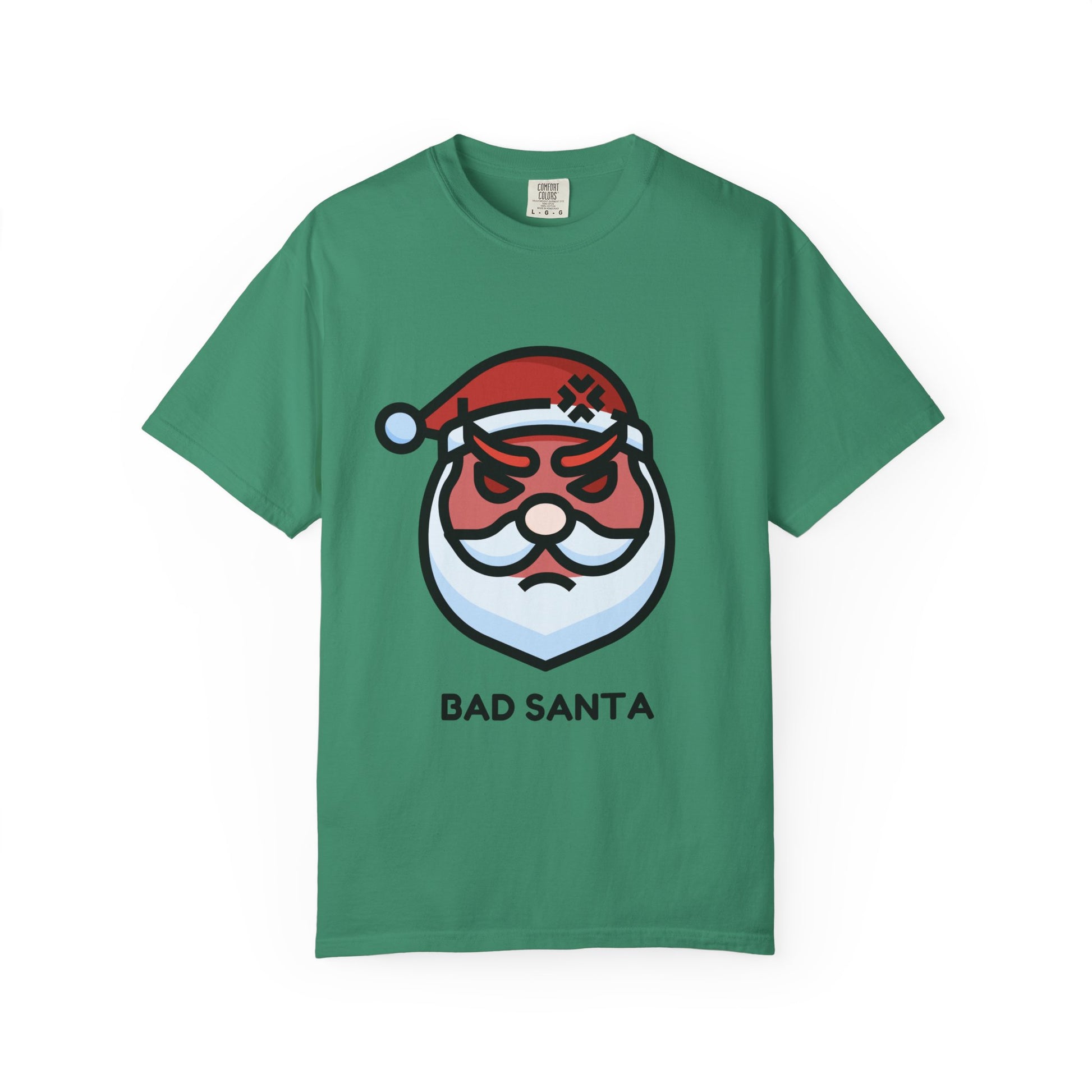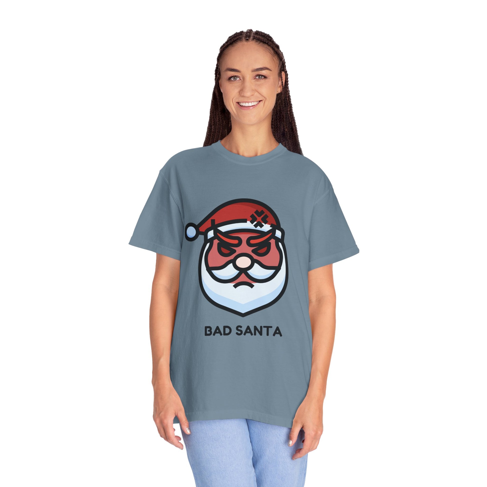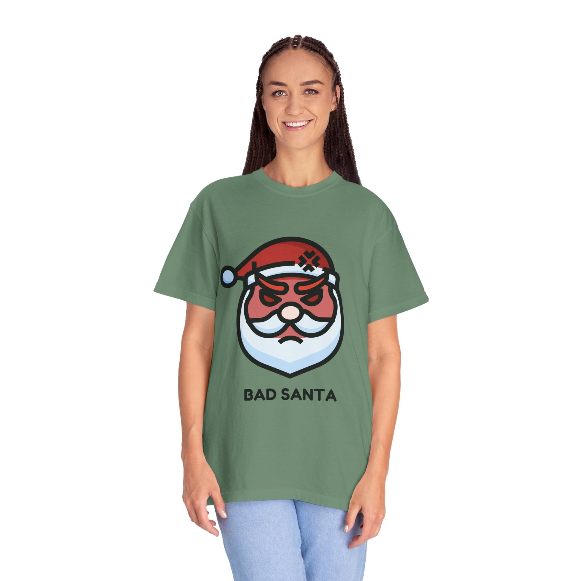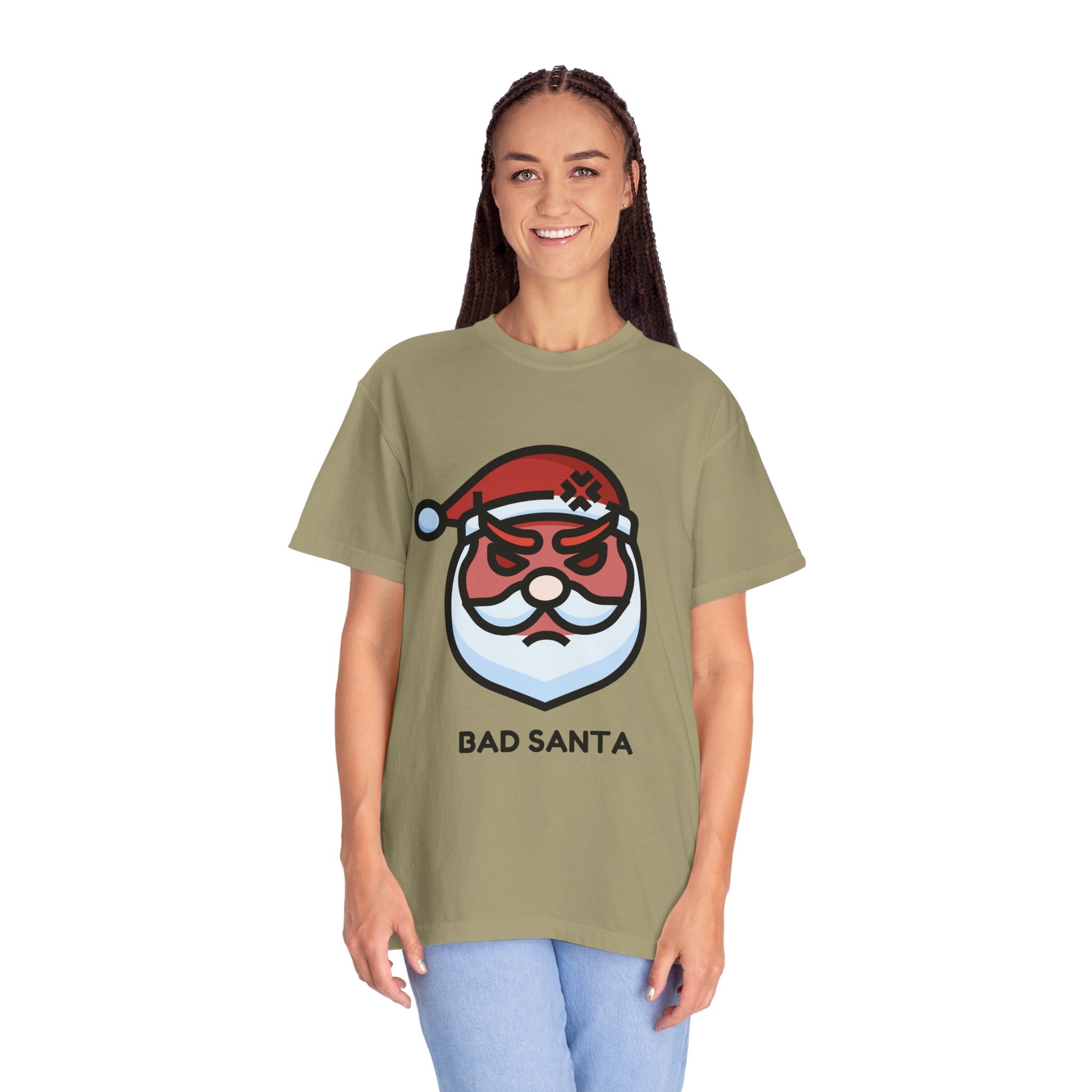 This relaxed, garment-dyed tee carries a sly sense of holiday mischief—an illustrated "Bad Santa" face sits center chest, eyebrows furrowed, bandage on his hat, and a trimmed beard that reads more rogue than jolly. The soft, broken-in hand of the Comfort Colors fabric gives the print a lived-in look that’s comfortable from the first wear. Layer it under a flannel for late-night cookie raids, wear it to low-key holiday parties where wit wins, or pull it on for a winter road trip when you want to wink at tradition without taking it too seriously. The relaxed cut and medium-weight cotton mean this shirt moves with you—whether you’re trimming lights, wrapping last-minute gifts, or grabbing coffee before the family chaos begins.