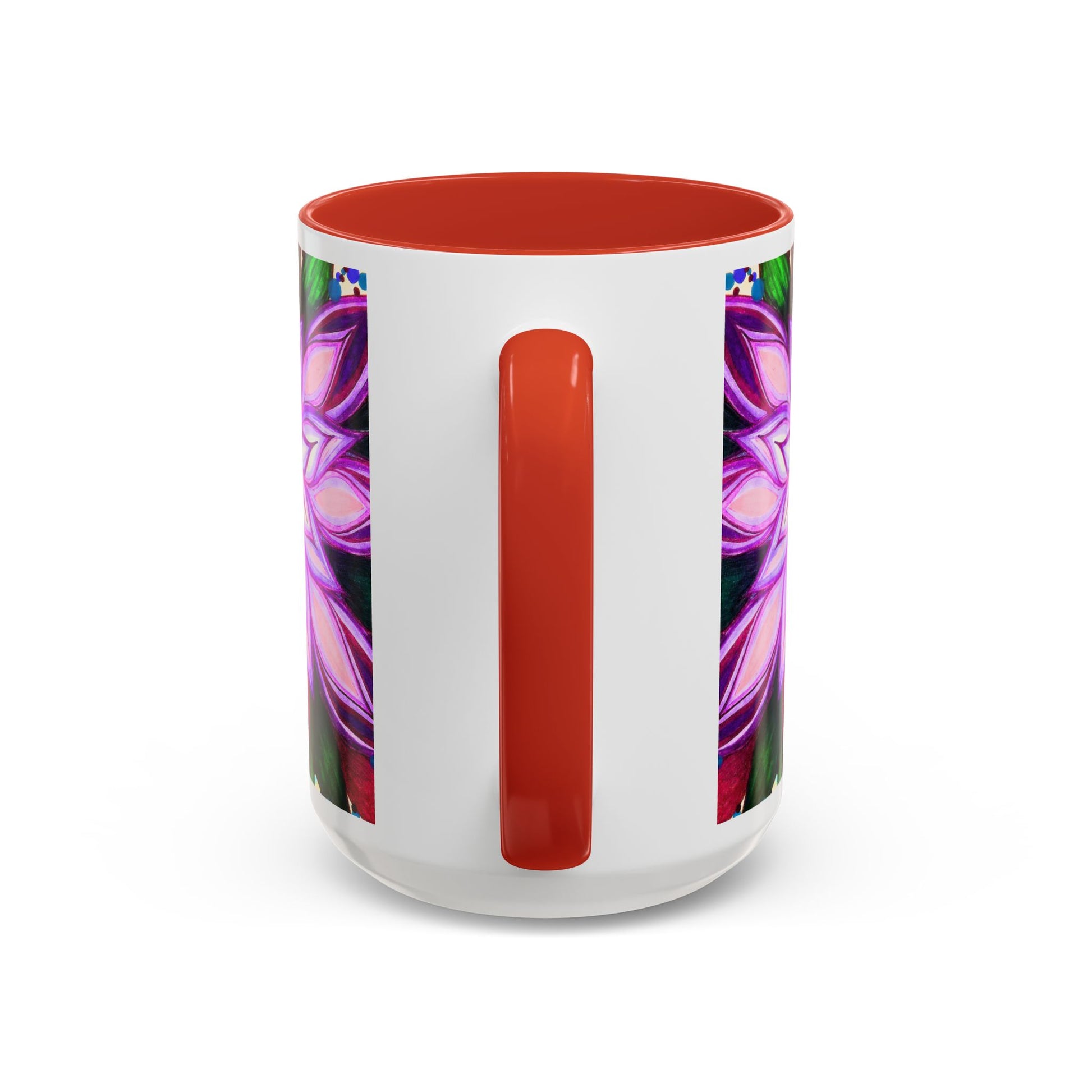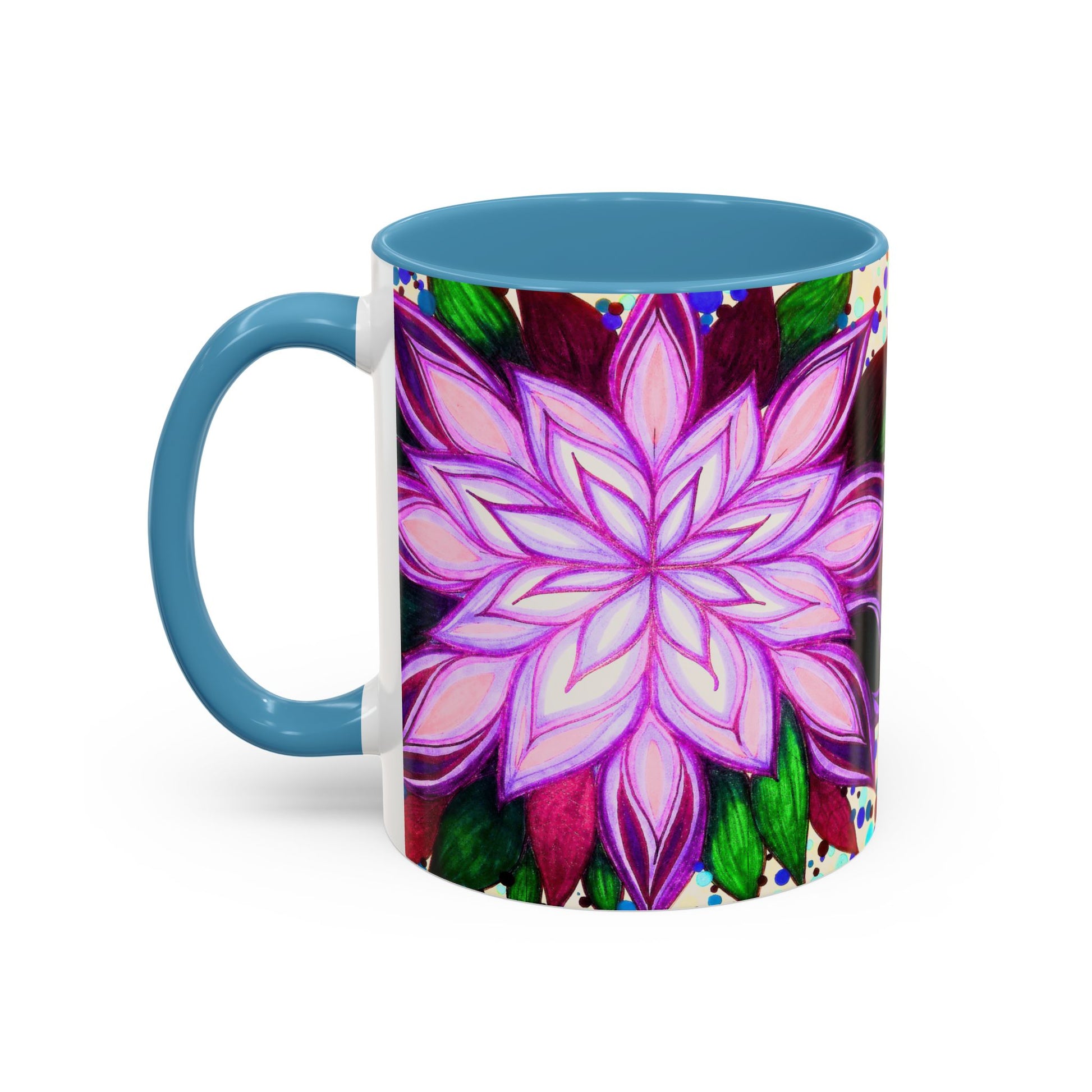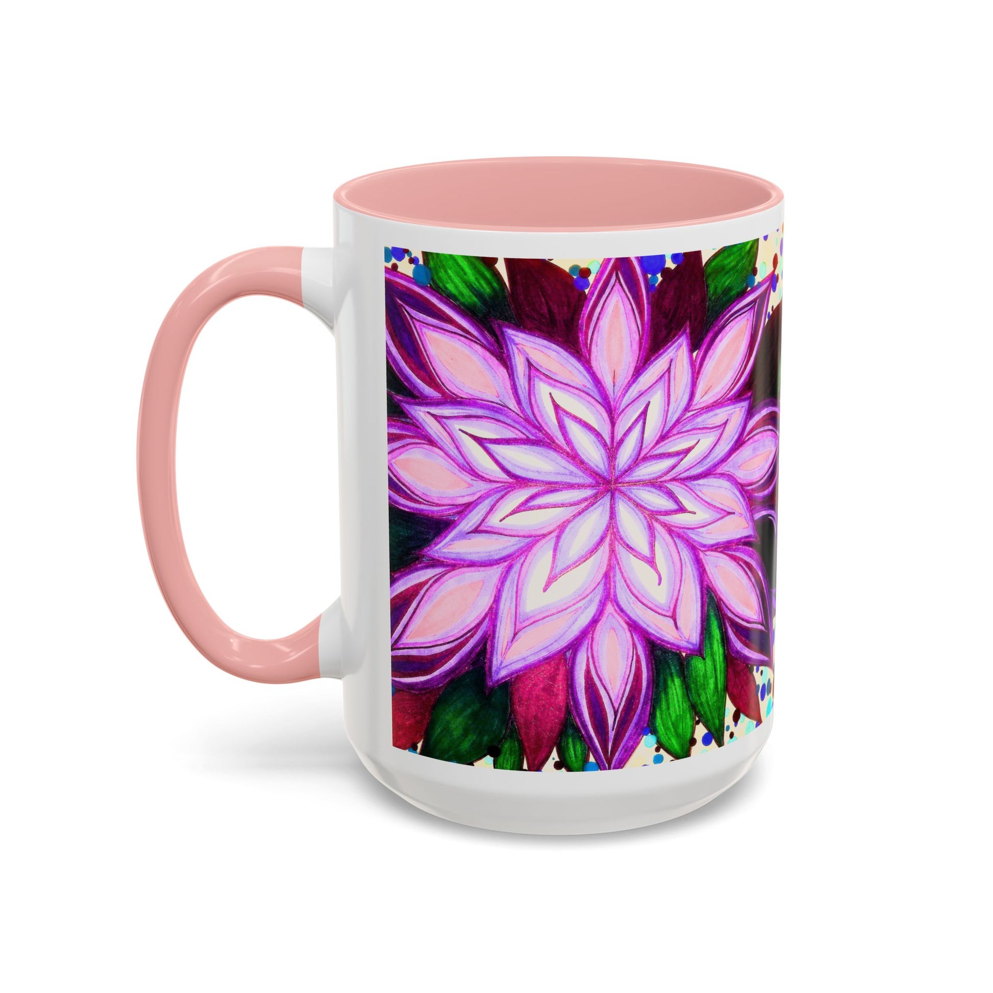 This vibrant ceramic mug brings a hand-drawn floral mandala into your daily ritual. Bold magenta and violet petals radiate from the center against a playful confetti-speckled background, while the colored interior and handle add a striking contrast. Warm beverages feel more joyful in this glossy, eye-catching cup — it sits well on a cluttered creative desk, beside a sketchbook, or in a kitchen where color matters. Carry a little studio energy to morning coffee, afternoon tea, or a late-night cocoa. The substantial 11 oz and 15 oz sizes give you the right pour for focus sessions or slow, lingering sips.