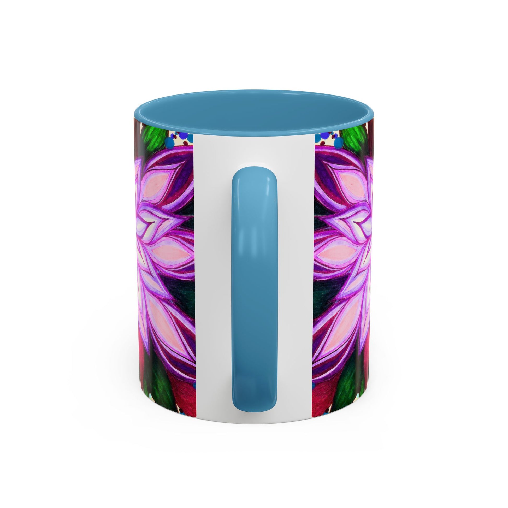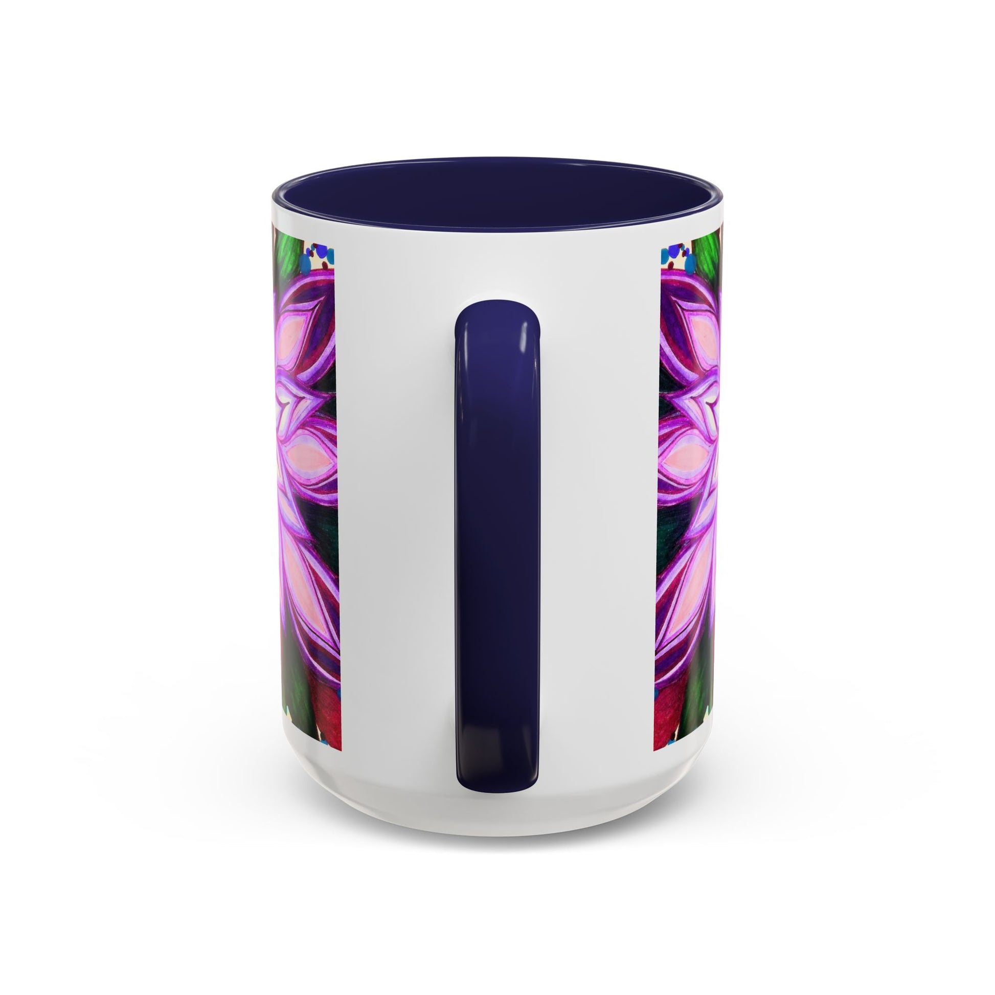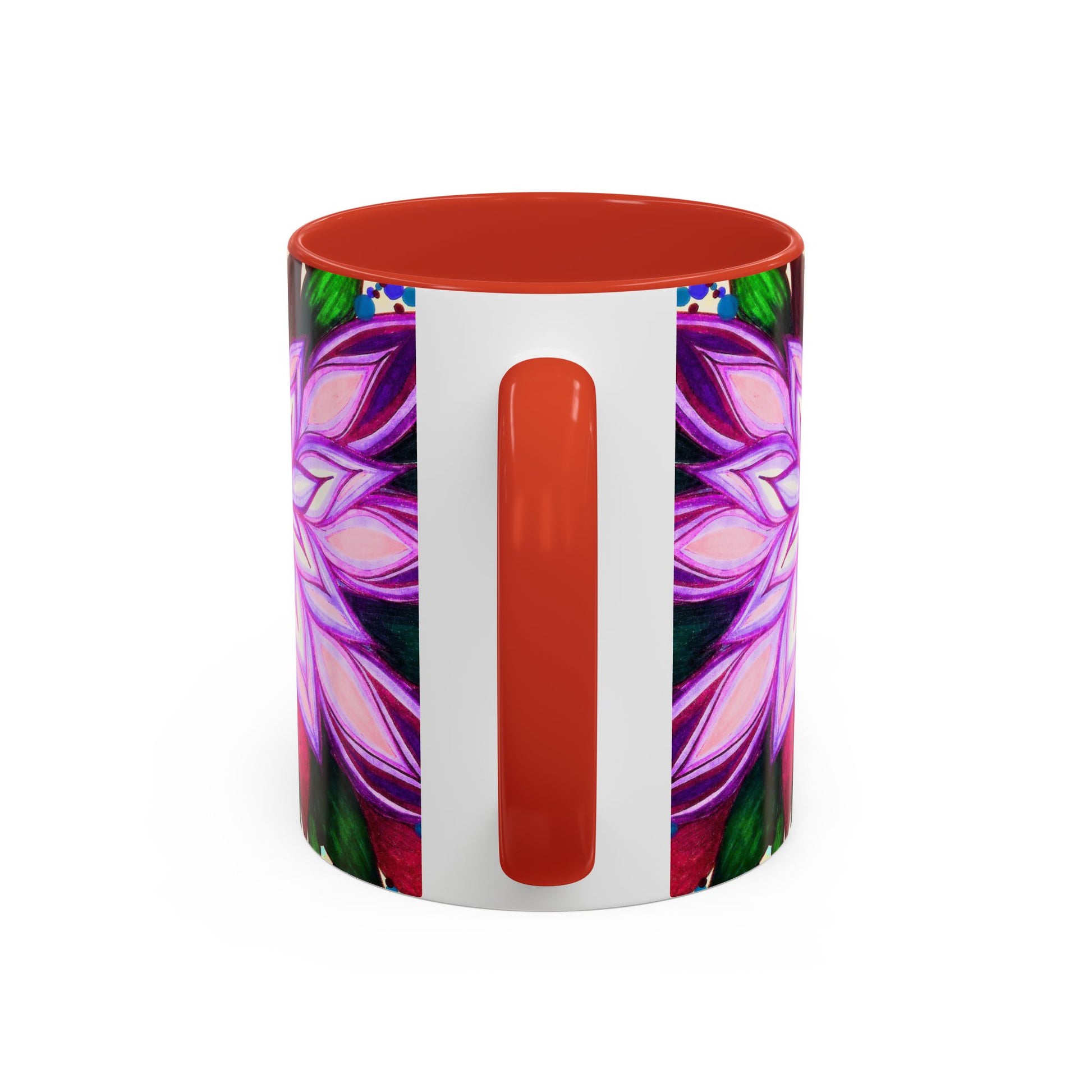 This vibrant ceramic mug brings a hand-drawn floral mandala into your daily ritual. Bold magenta and violet petals radiate from the center against a playful confetti-speckled background, while the colored interior and handle add a striking contrast. Warm beverages feel more joyful in this glossy, eye-catching cup — it sits well on a cluttered creative desk, beside a sketchbook, or in a kitchen where color matters. Carry a little studio energy to morning coffee, afternoon tea, or a late-night cocoa. The substantial 11 oz and 15 oz sizes give you the right pour for focus sessions or slow, lingering sips.