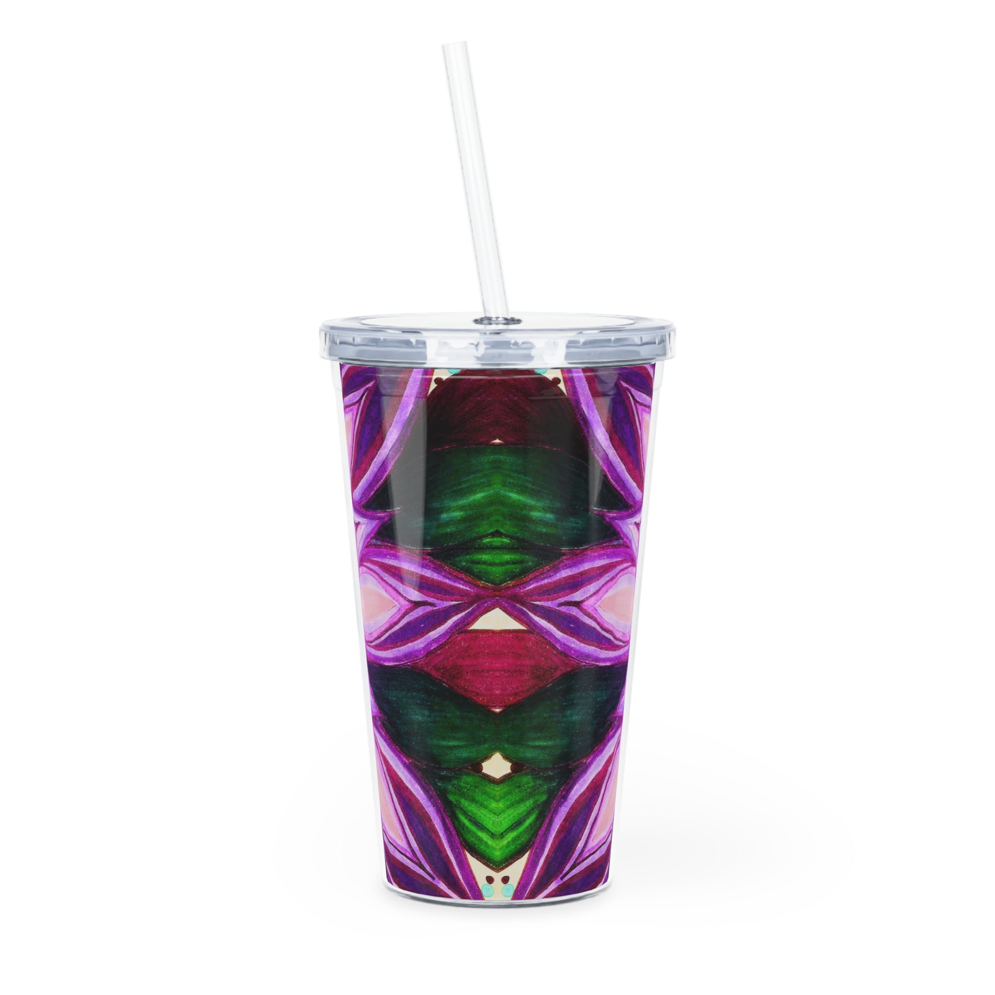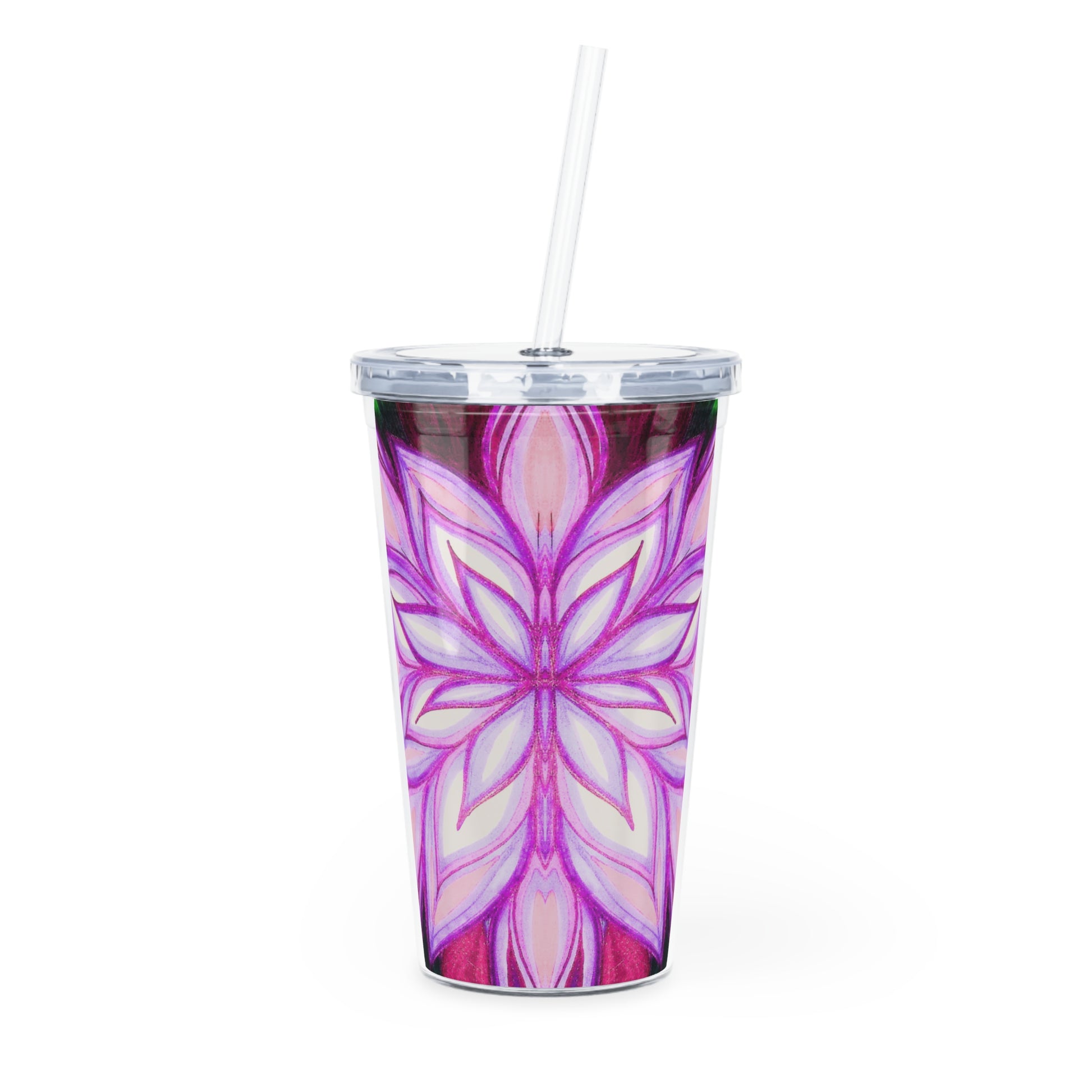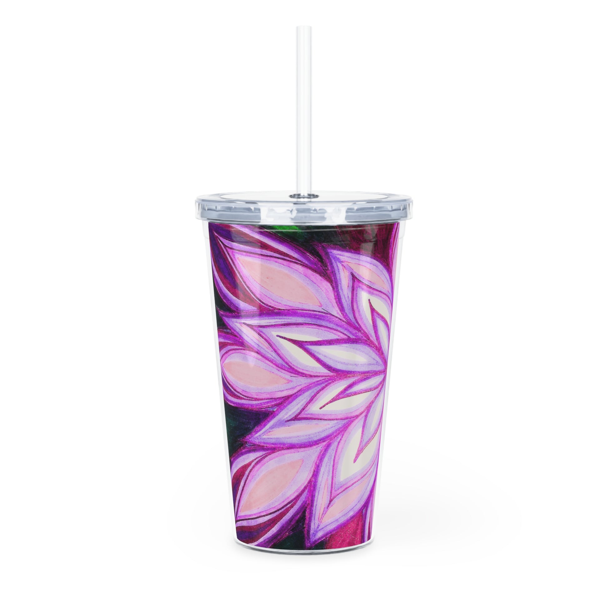 Sip with color and calm. This 20oz double-wall tumbler wraps a hand-painted floral mandala in lively magenta and soft lavender hues. The layered petals glow against deeper berry tones, catching light as you move. Use it for iced coffee on your morning walk, herbal tea during a late-night sketch session, or cold water while you garden. The clear lid and straw make it easy to drink on the go, and the removable insert gives a clean, gallery-like display of the artwork. It feels personal — like carrying a small piece of a sunlit studio wherever you go.