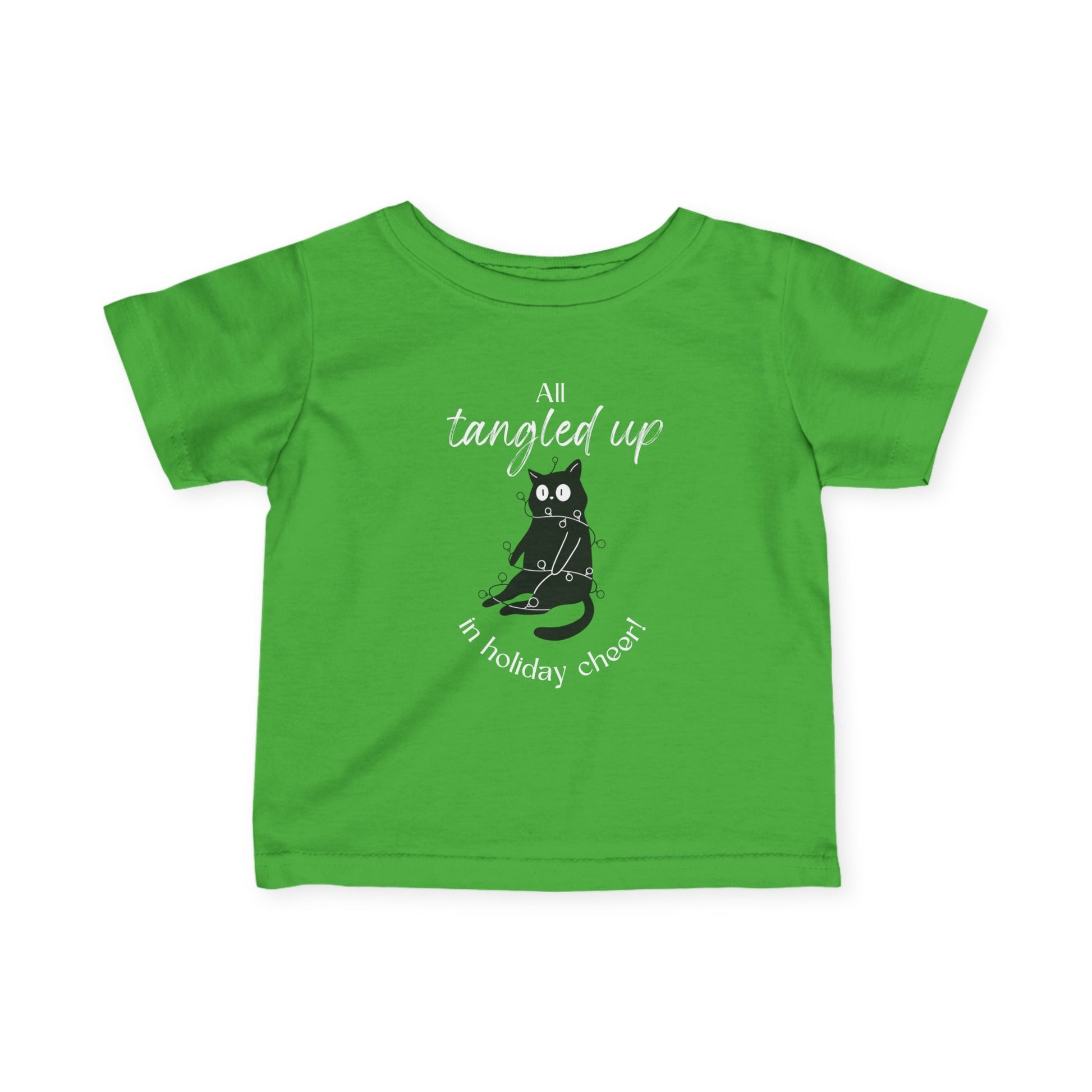 A soft, lightweight infant tee that brings a wink of holiday mischief to tiny wardrobes. The smooth, ring-spun cotton knit feels gentle against sensitive skin while holding its shape through baby’s wiggles thanks to shoulder tape and side seams. A playful black cat illustration with the script “All tangled up in holiday cheer” sits at the chest, adding cozy seasonal charm without overwhelming the look. The ribbed collar stretches for easy on-and-off and reclaims its shape after washes. Breathable and light, this classic-fit tee layers well under sweaters or pairs with leggings for everyday festive moments.