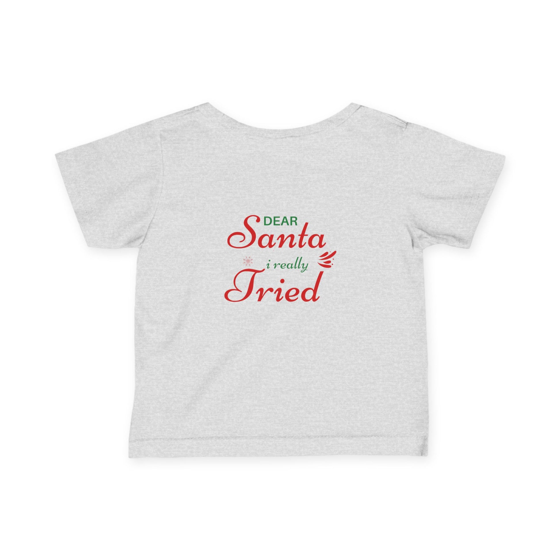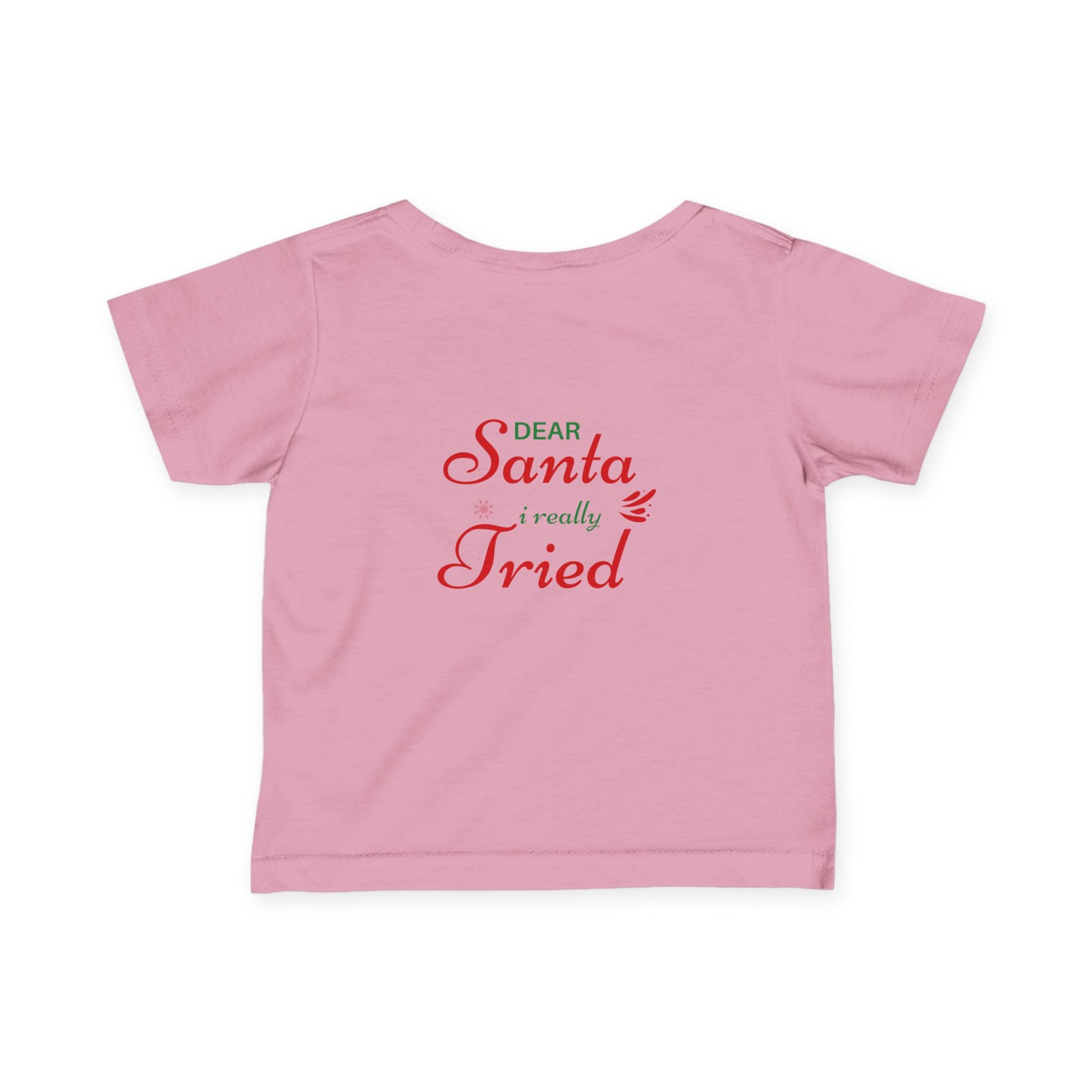 Soft, lightweight baby tee with a playful holiday message — ‘Dear Santa I really Tried’ — printed in gentle red and green script. The classic-fit shirt drapes comfortably on little ones, offering breathable 100% combed ring-spun cotton in solid colors (with heather blends available). Subtle structural details like side seams, ribbed knit collar, and shoulder tape keep the tee looking neat through holiday play and family photos. It’s a cozy, sweet layer that brings a warm, honest smile to festive mornings and quiet bedtime stories by twinkling lights.