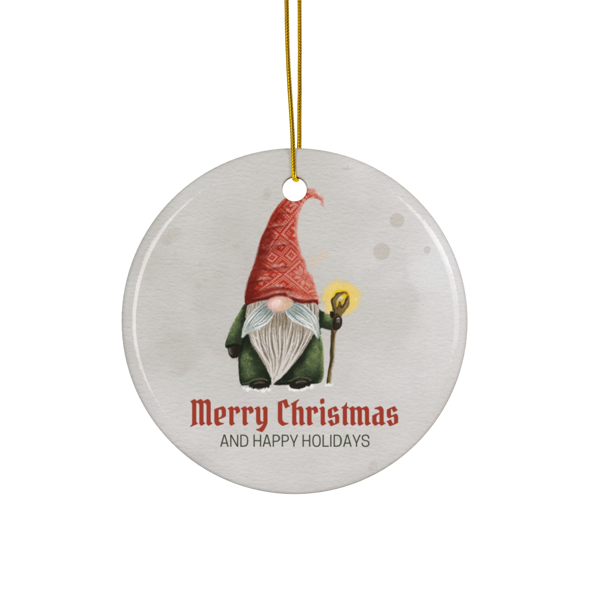 A glossy ceramic ornament that brings a warm, handcrafted holiday touch to any tree or cozy corner. The smooth, vibrant print shows a charming gnome holding a candle, rendered in rich reds and greens that retain crisp detail thanks to advanced printing. Lightweight but sturdy 3mm ceramic feels substantial in hand while the single-piece construction ensures the artwork won’t peel or separate. A gold-toned hanging string threads through a pre-drilled hole so it’s ready to display right out of the package.