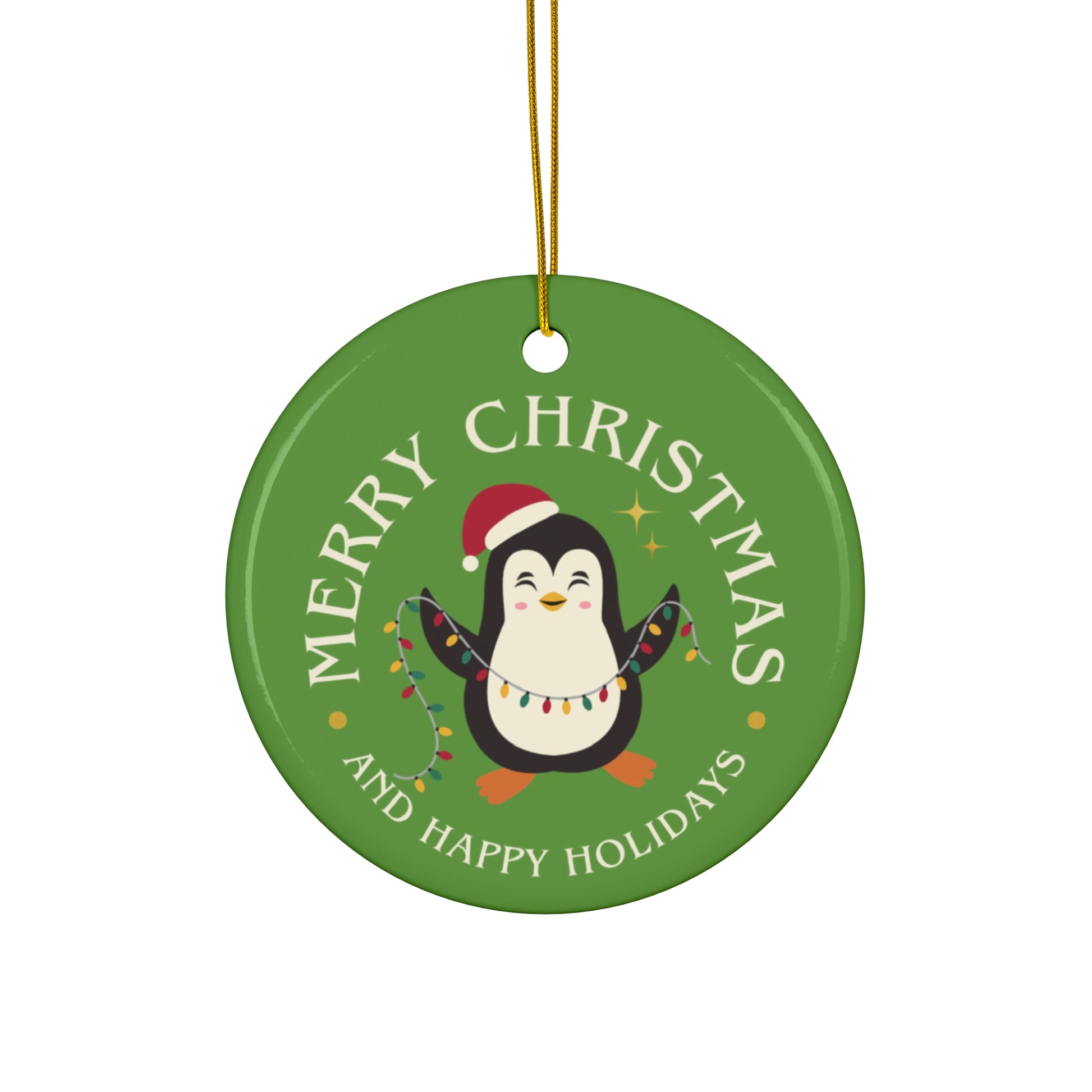 Bring a little joyful cheer to the tree with this glossy ceramic ornament. The round, one-sided print features a playful penguin wrapped in holiday lights and a Santa hat, set against a rich green background and a warm “Merry Christmas and Happy Holidays” message. Lightweight but sturdy 3mm ceramic holds bright, crisp colors that pop from every angle. A gold-toned string is included and threaded through a pre-drilled hole, ready to hang on branches, wreaths, or gift packages. Each purchase contains a single ornament — a small, cheerful accent that adds personality and nostalgic warmth to seasonal décor.