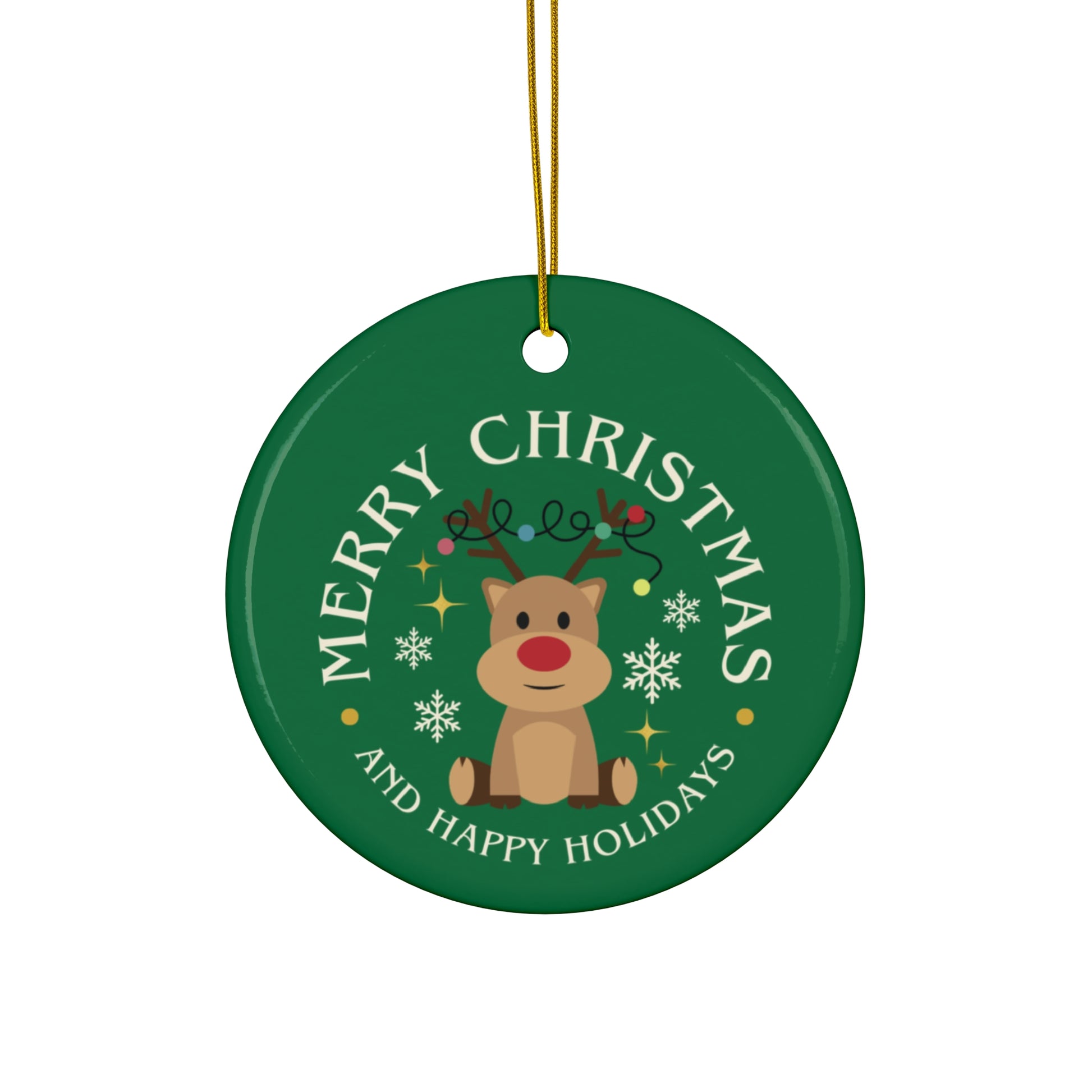 A glossy ceramic ornament that brings warm holiday cheer to any tree or mantel. Bright, full-color printing captures every detail of the playful reindeer design against a deep green background. The smooth, durable ceramic face sits on a solid one-piece body with a neat hanging hole and gold-toned string included — ready to add a touch of whimsy to seasonal décor. Lightweight but sturdy, each single-sided ornament keeps colors vivid year after year and makes it easy to celebrate small traditions and cozy moments during winter gatherings.