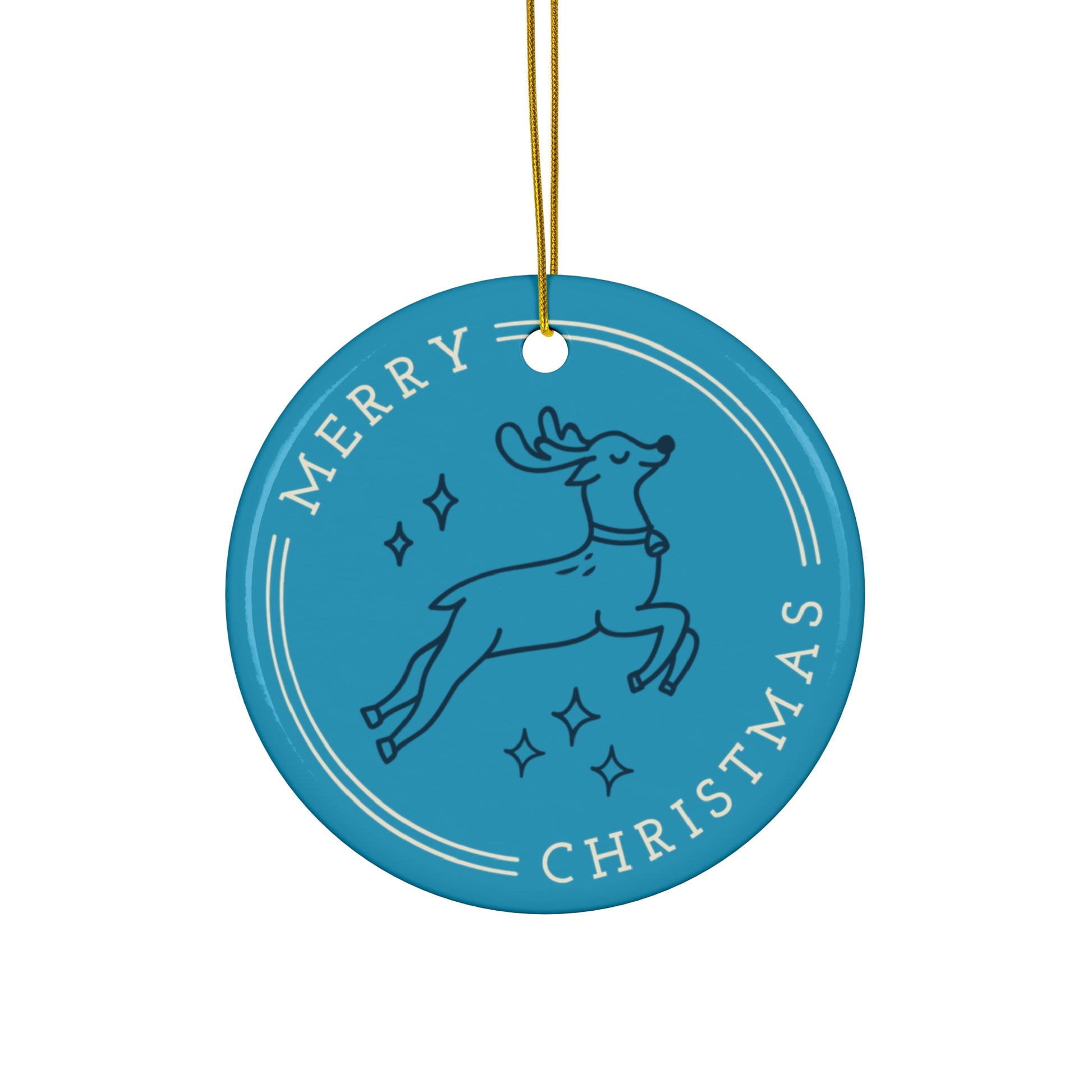 A glossy ceramic ornament that brings a bright, cheerful note to holiday décor. This single-sided, one-piece ornament showcases clean, vivid printing in bold color and a playful reindeer motif set inside a circular frame. Lightweight yet sturdy at 3mm thick, it arrives ready to hang with a gold-toned string threaded through a pre-drilled hole. The smooth, glossy surface makes the artwork pop and adds a polished finish to tree branches, garlands, or seasonal displays.