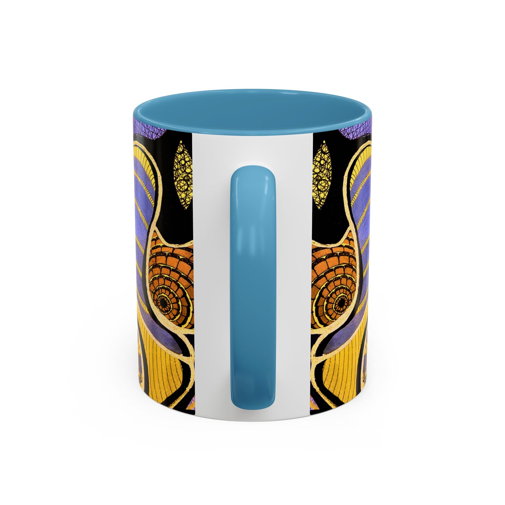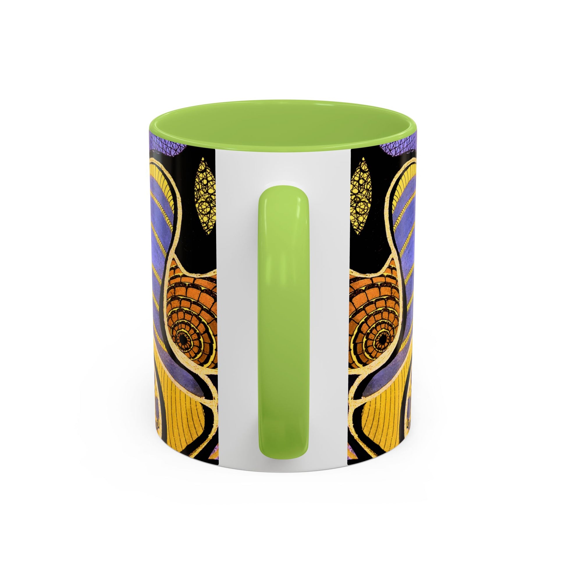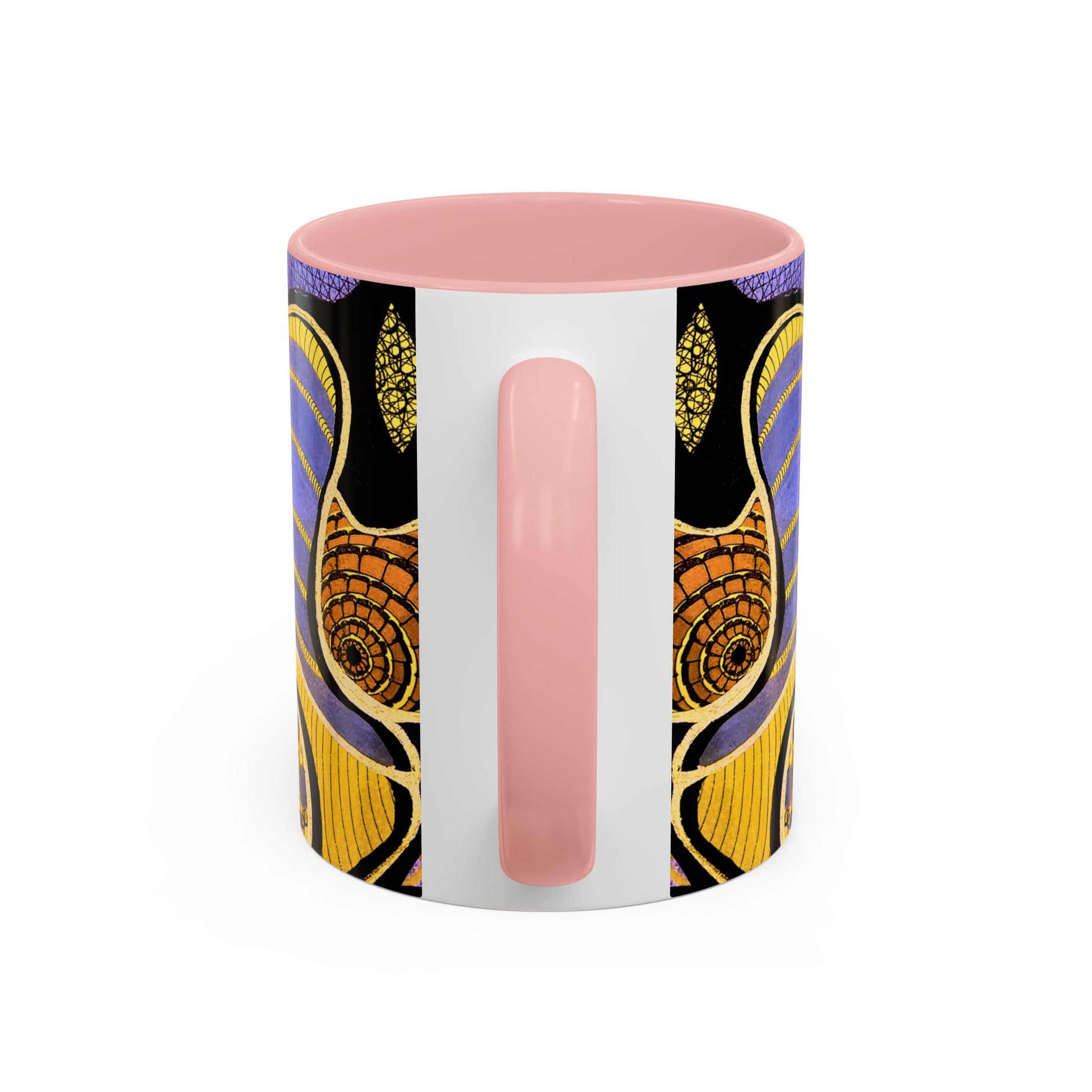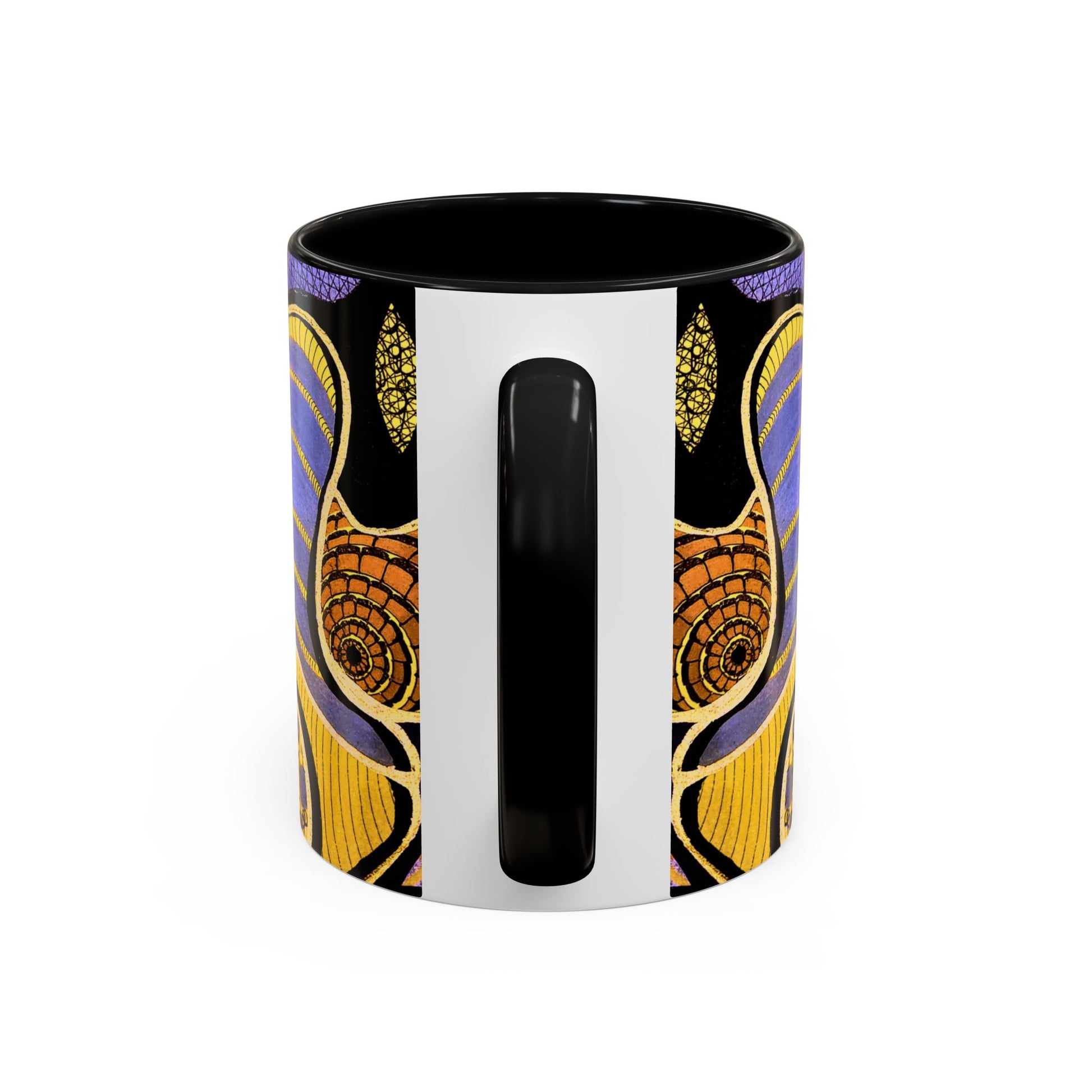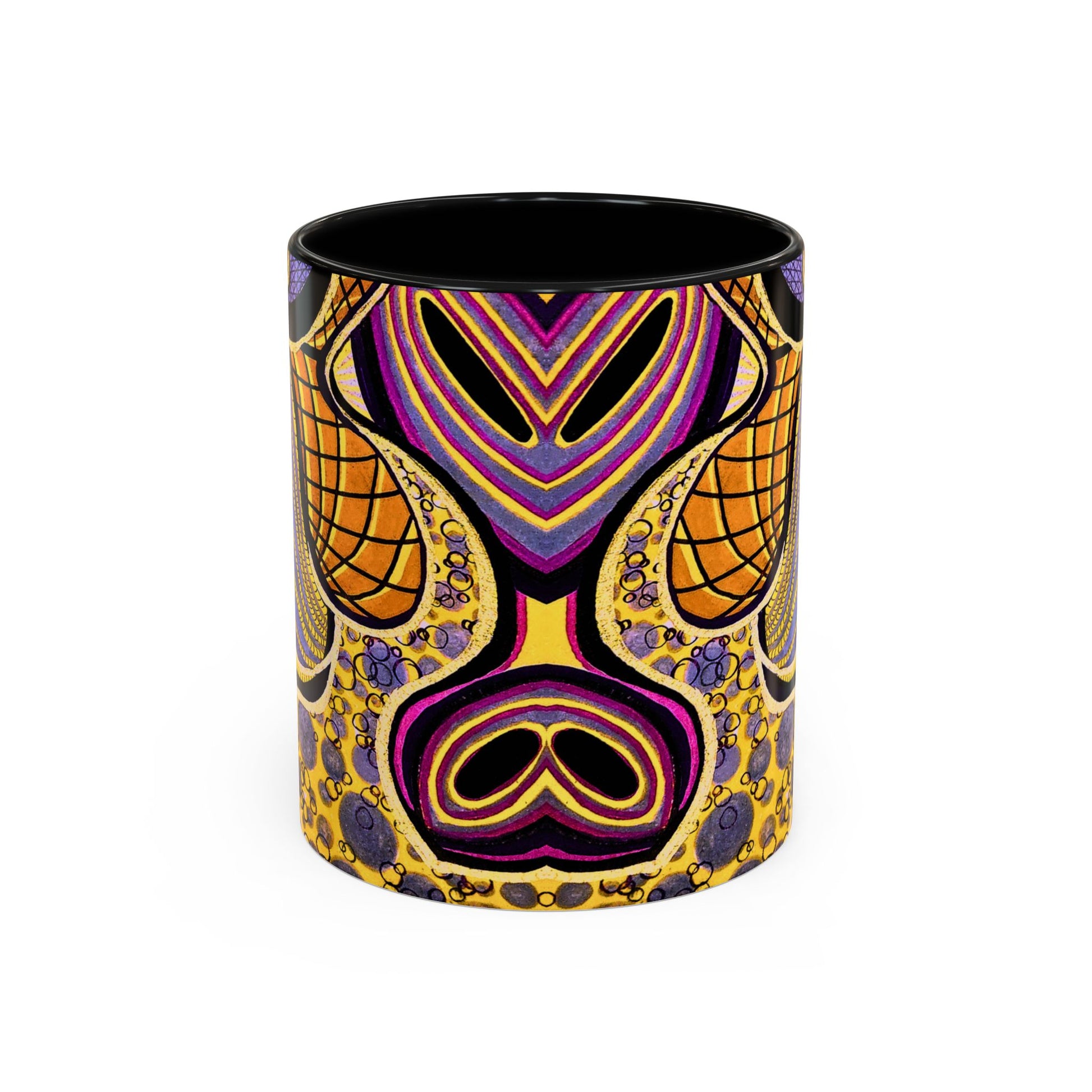 Sip slowly and let the colors unfurl. This ceramic mug carries a bold, psychedelic pattern — rich golds, deep violets, and inky black outlines — that feels both vintage and modern. It warms hands and brightens mornings, turning ordinary coffee or tea into a small ritual. The glossy finish amplifies the vibrant print while the colored interior and handle add a tailored pop that matches the design’s energy. Use it on quiet studio mornings, during sketch sessions, or when you need a vivid lift between meetings.
