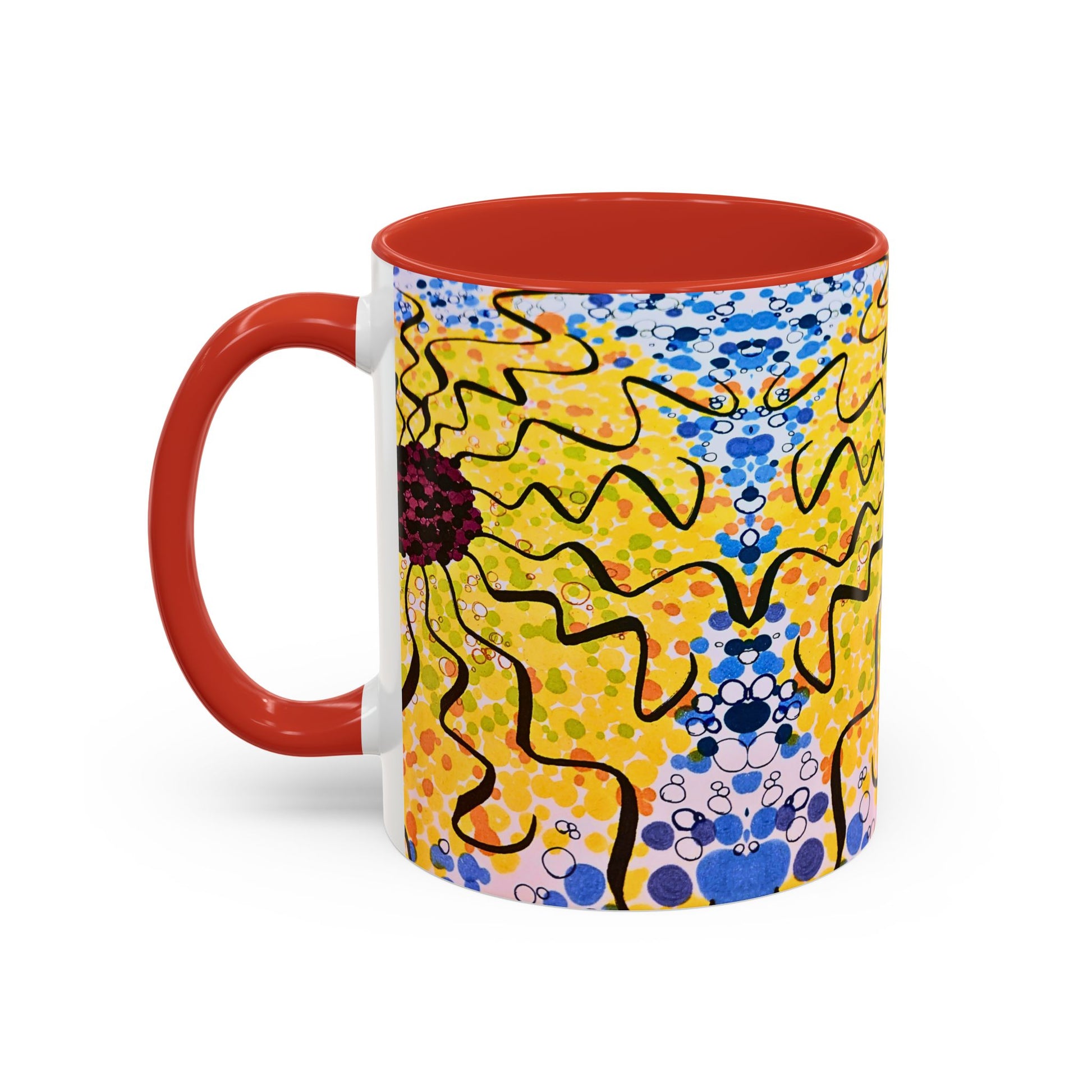 Bright, bold, and a little bit joyful — this ceramic accent mug brings a splash of hand-painted sunshine to slow mornings and busy desks alike. The vivid sunflower-inspired design wraps around the cup with energetic brushstrokes and playful dots, while the colored interior and handle add contrast that pops. It feels like an artful pause: warm coffee, a quiet moment, and a burst of color to lift the day. For people who collect lively ceramics or anyone who loves cheerful tableware, this mug adds personality to everyday routines and small gatherings.