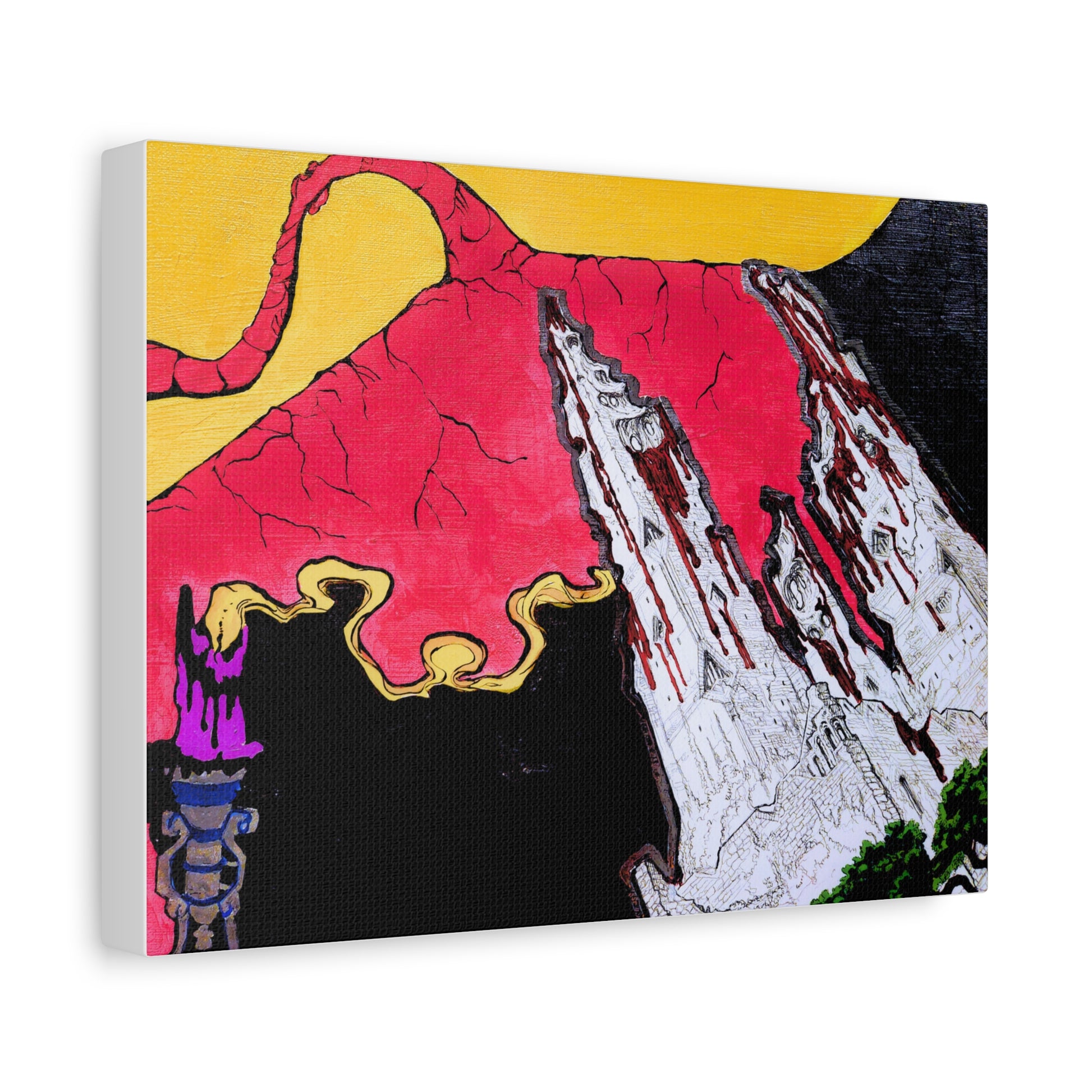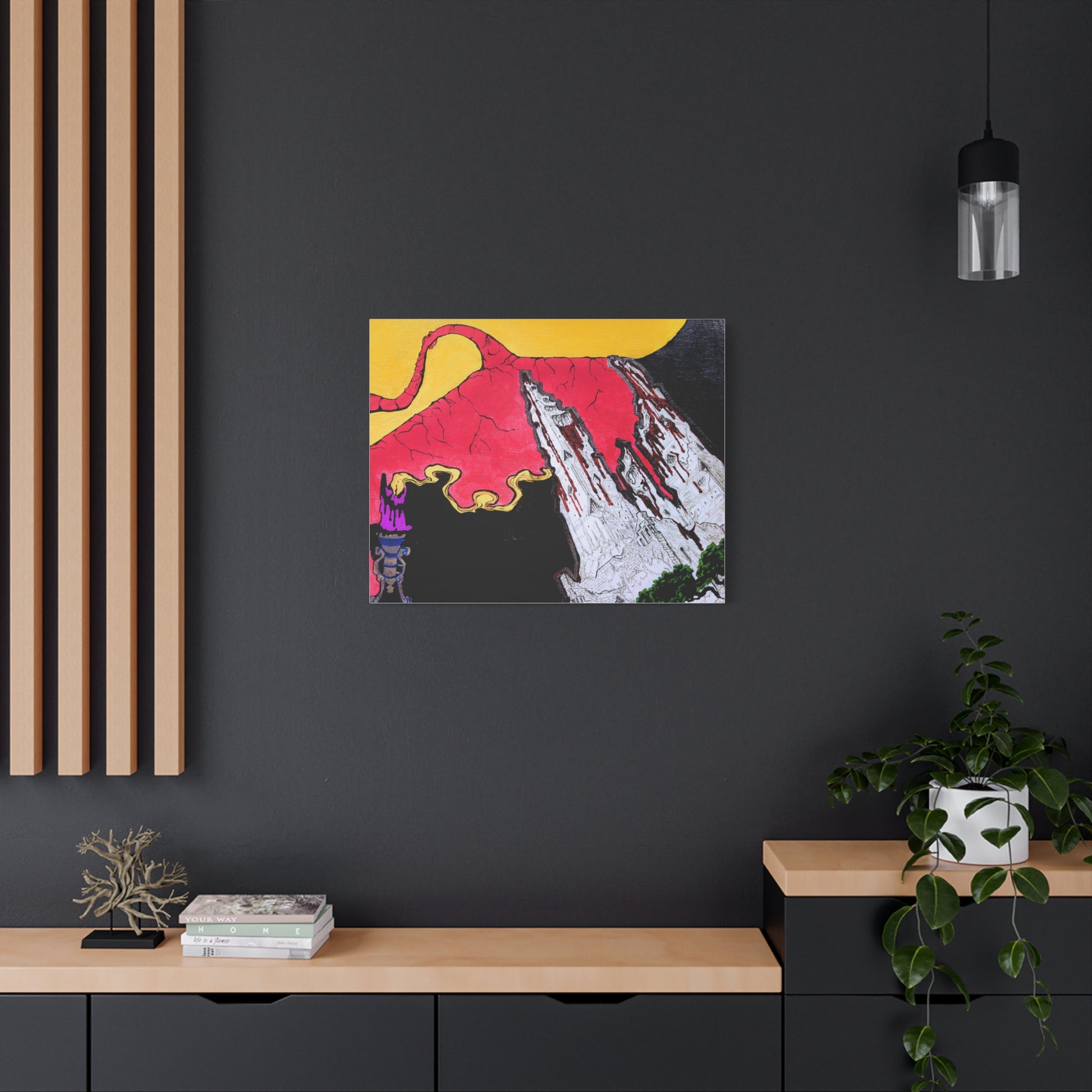 This stretched matte canvas brings bold, hand-drawn energy into your space. Vivid, saturated colors sit on a velvety matte surface that reduces glare and emphasizes the artwork’s textured feel. The slim 1.25" profile keeps the look modern and gallery-ready, while the wrapped edges keep the composition continuous from front to side. Lightweight yet sturdy, it arrives ready to hang so you can add an instant focal point to a living room, studio, or entryway. The vivid reds and deep contrasts make this piece a conversation starter—great for people who collect eclectic, graphic art and want something that reads like a poster but feels like a fine print.