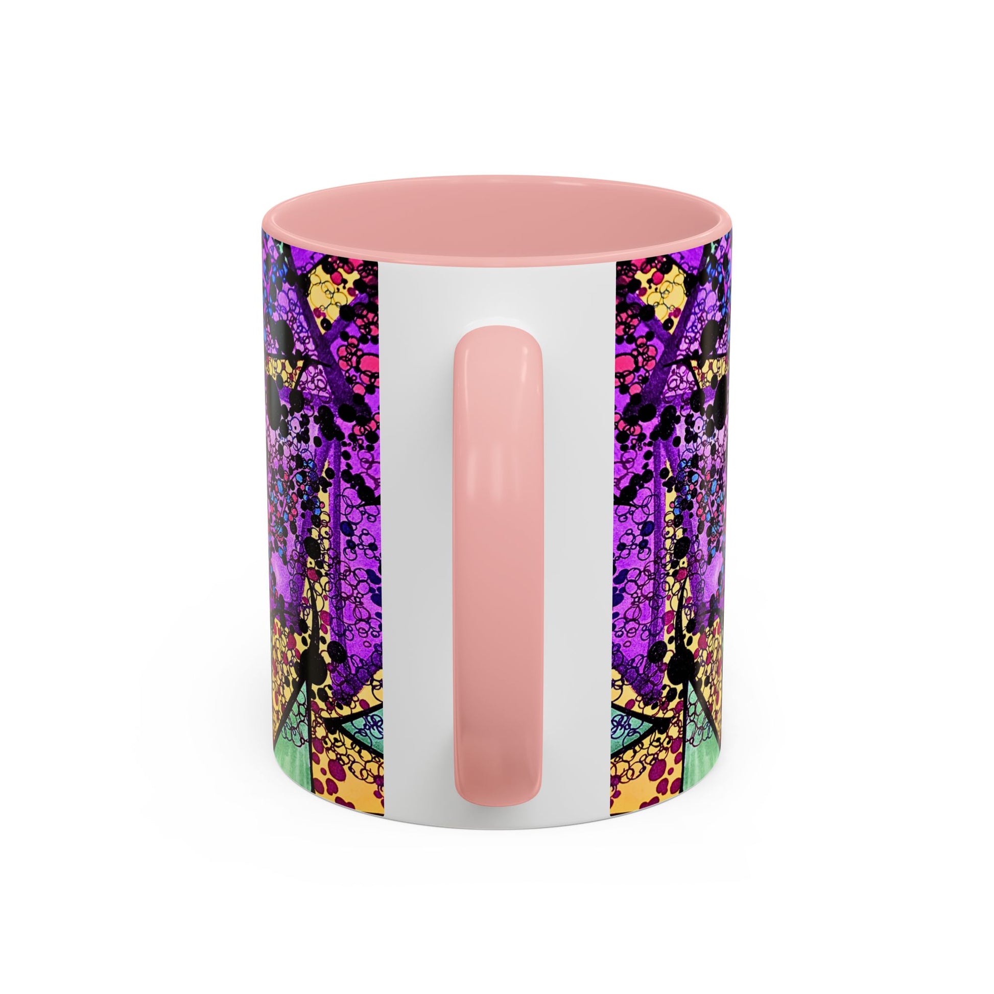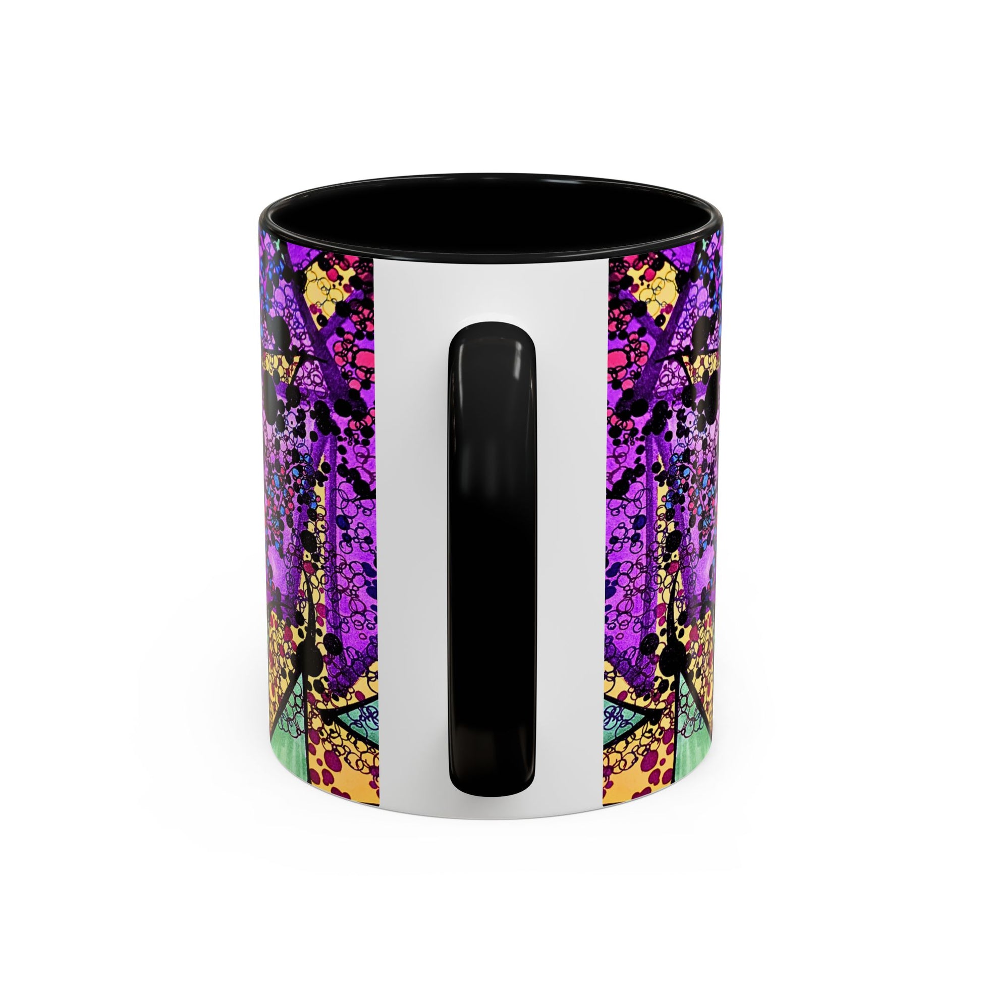 A vibrant ceramic mug that brings a burst of color to morning routines and late-night creativity. Deep black interior and handle frame a kaleidoscopic design of saturated purples, magentas, and jewel tones that feel both electric and handcrafted. It holds a generous pour, cleans up easily, and stands up to everyday use while keeping the artwork bright. Reach for this mug when you want your coffee break to feel like a small, brilliant ritual — a splash of art that speaks to bold taste and playful mornings.