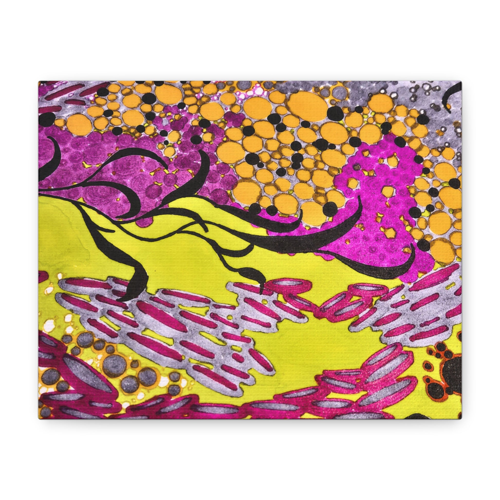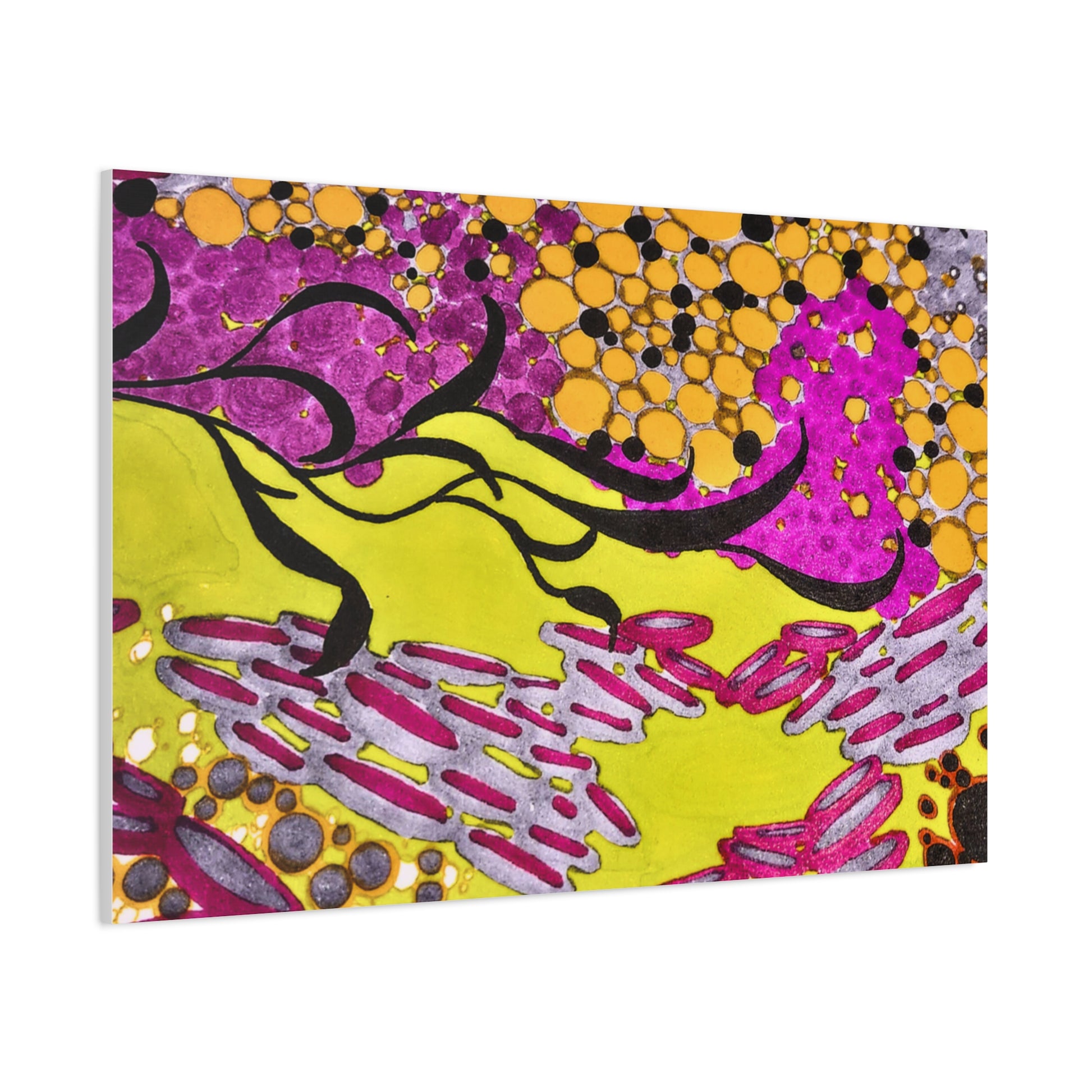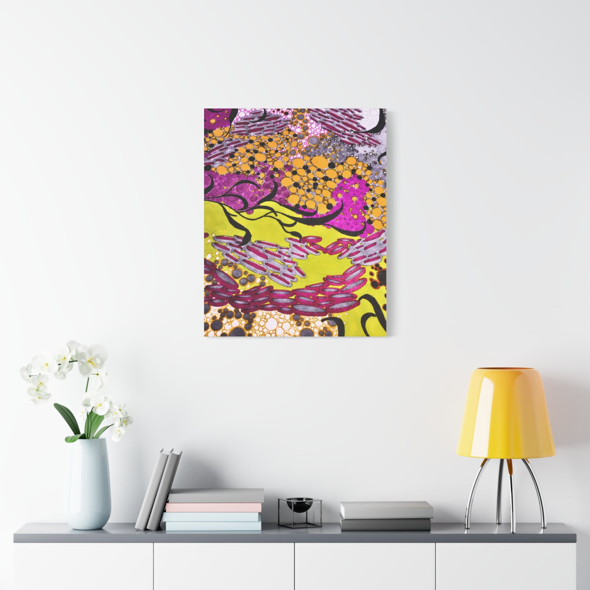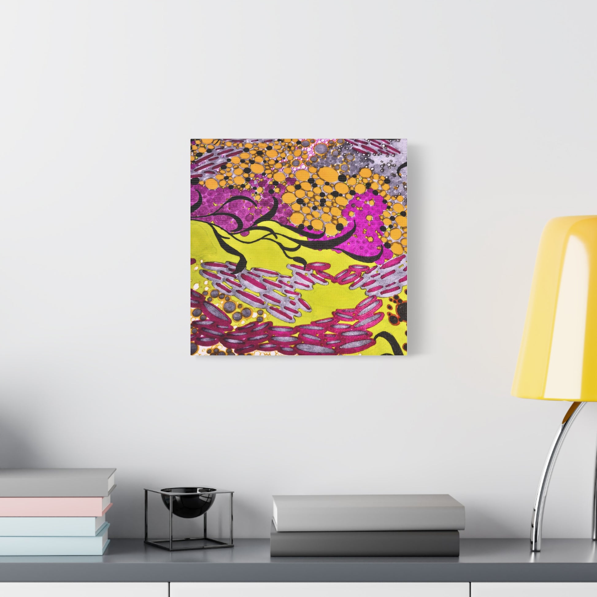 A vibrant stretched canvas that brings an energetic splash of color to any room. Bright lemon yellow fields ripple beneath magenta and plum accents, while pools of amber and graphite dots create movement and depth. The matte finish softens glare and invites close-up discovery — brush-like strokes and layered dots reveal more texture the longer you look. Lightweight but sturdy, this giclée-style canvas hangs flush against the wall and adds an immediate sense of play and creativity to studios, living rooms, or entryways. It reads as both contemporary abstract and joyful patterning, a piece that sparks conversation and lifts the mood of a space.
