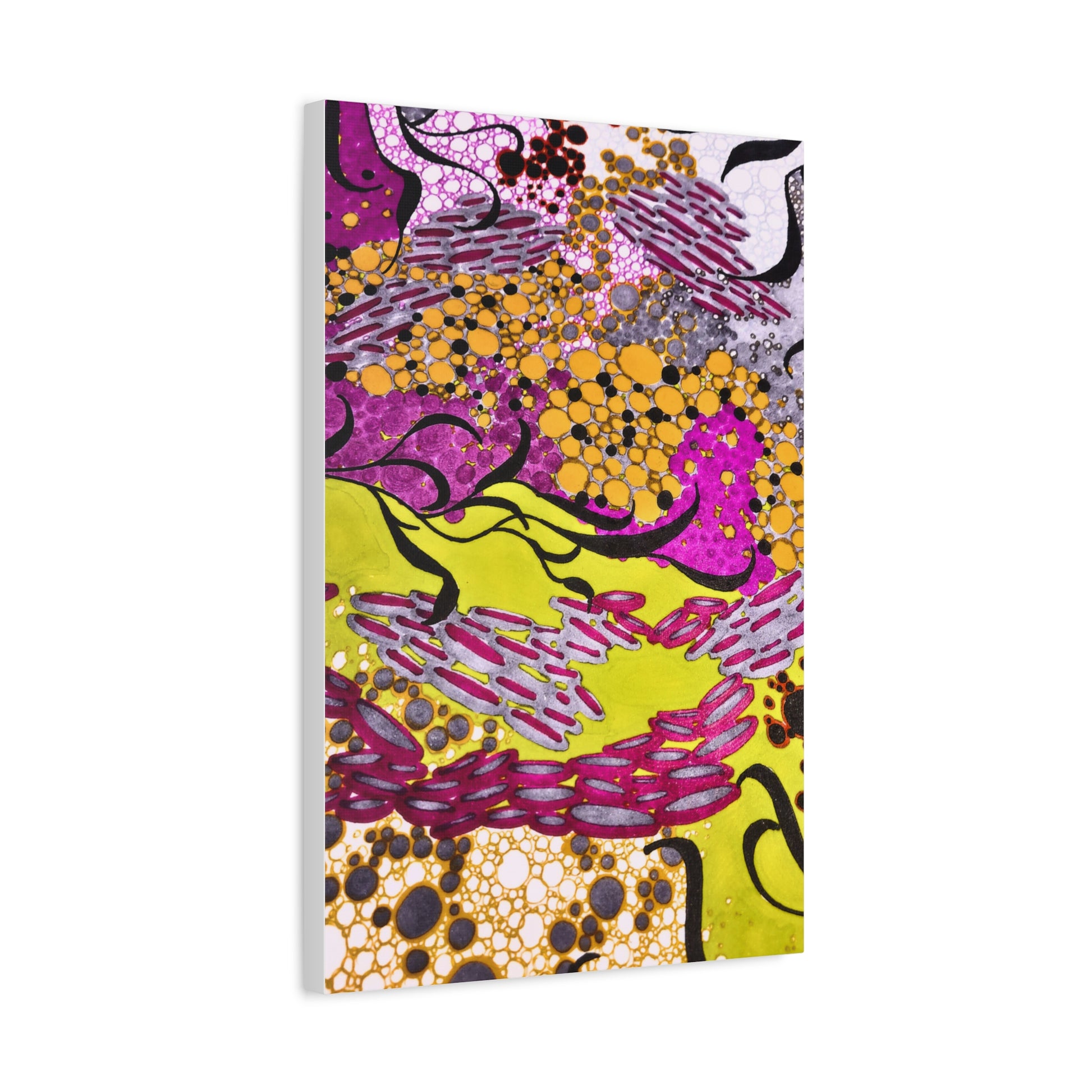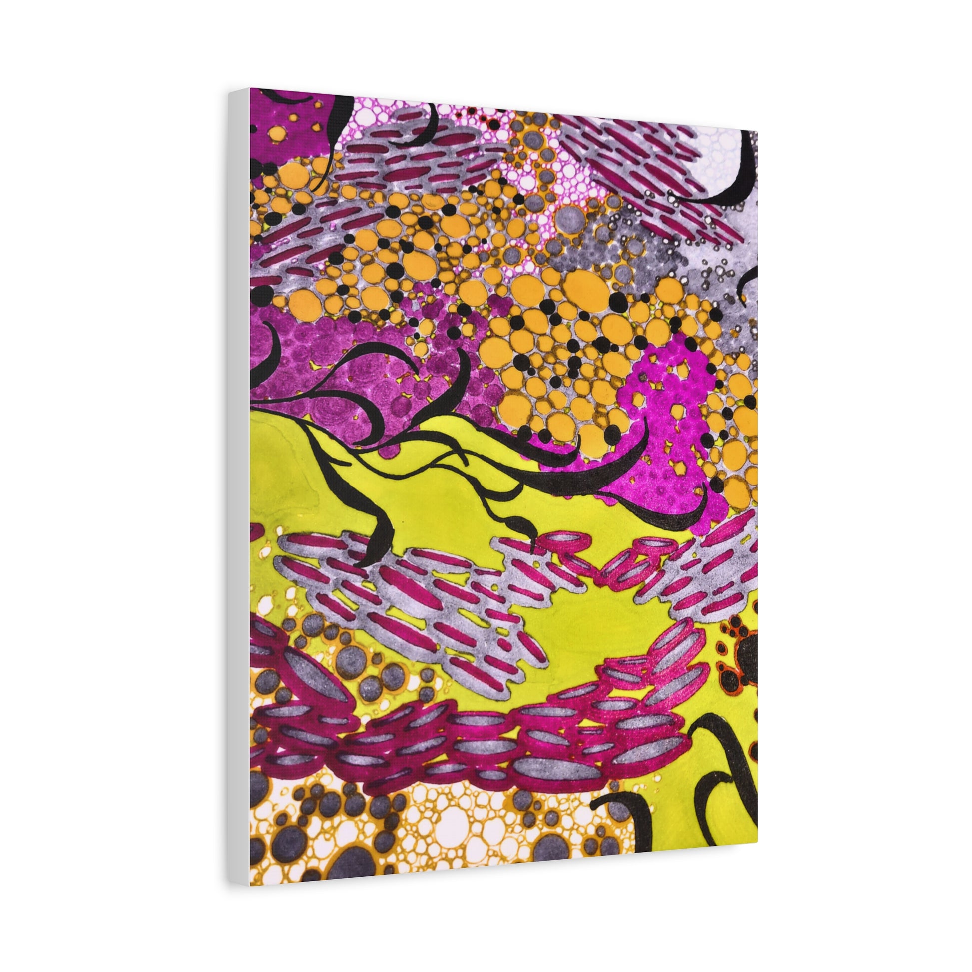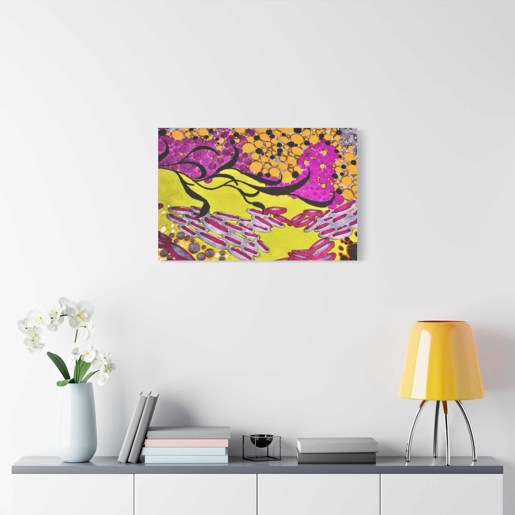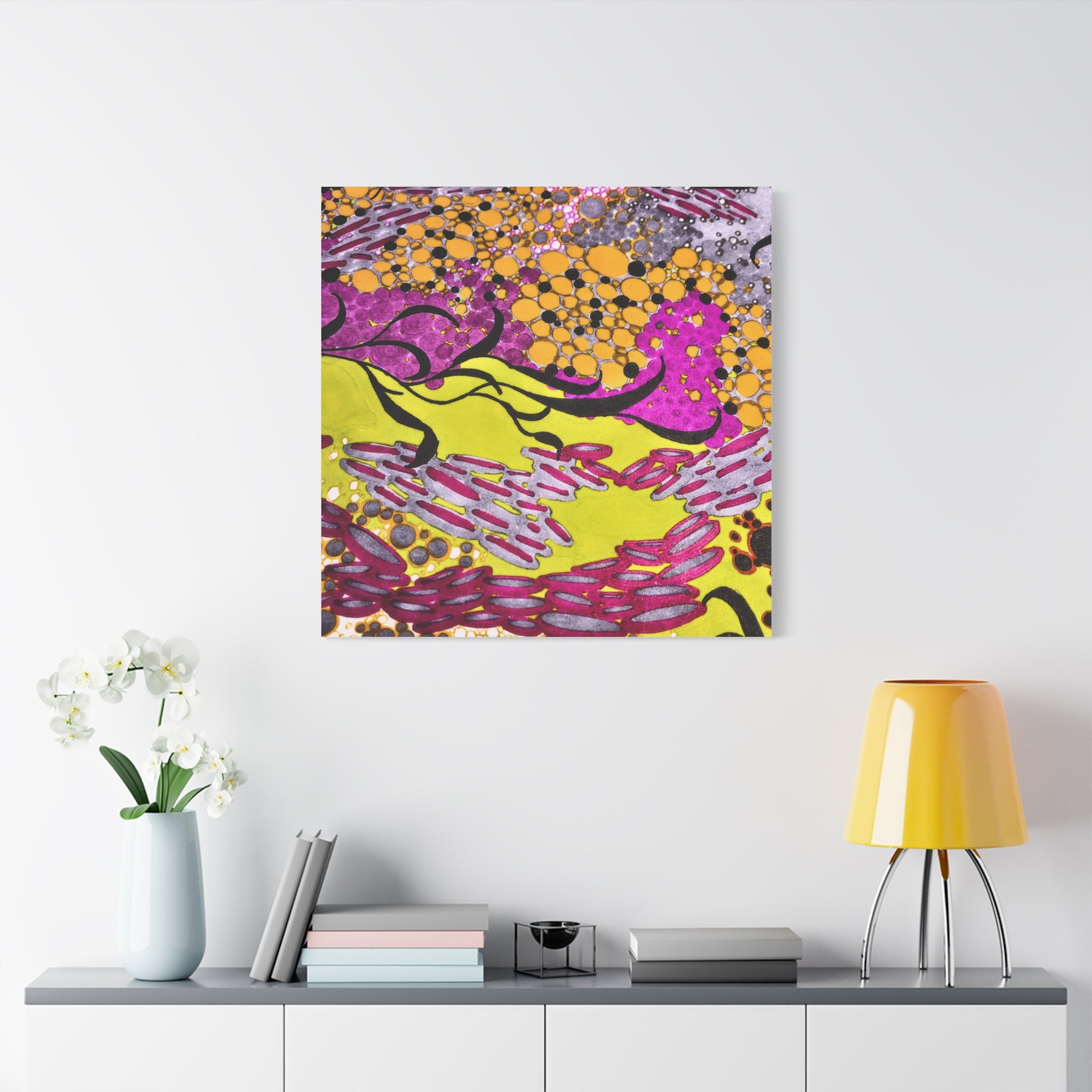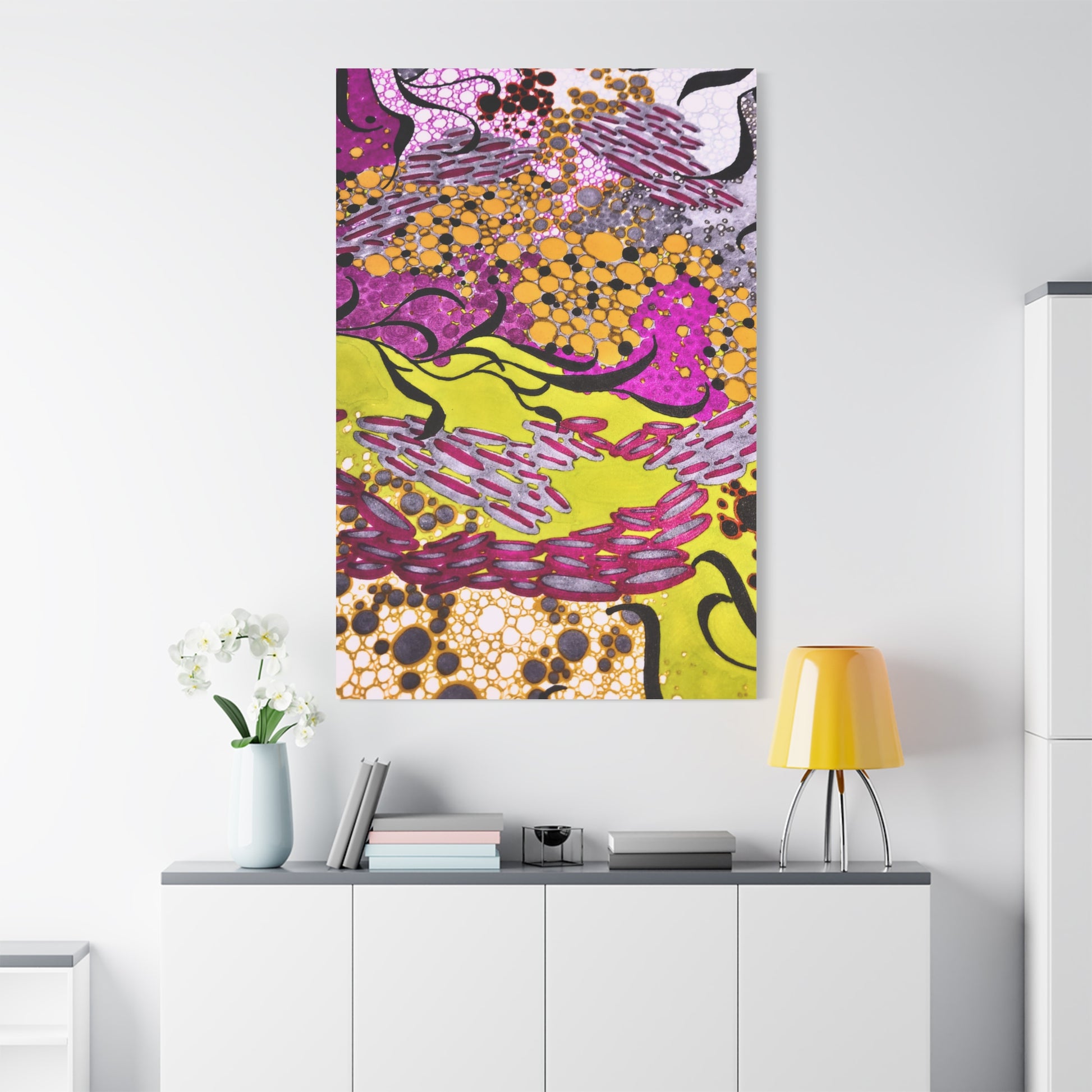 A vibrant stretched canvas that brings an energetic splash of color to any room. Bright lemon yellow fields ripple beneath magenta and plum accents, while pools of amber and graphite dots create movement and depth. The matte finish softens glare and invites close-up discovery — brush-like strokes and layered dots reveal more texture the longer you look. Lightweight but sturdy, this giclée-style canvas hangs flush against the wall and adds an immediate sense of play and creativity to studios, living rooms, or entryways. It reads as both contemporary abstract and joyful patterning, a piece that sparks conversation and lifts the mood of a space.