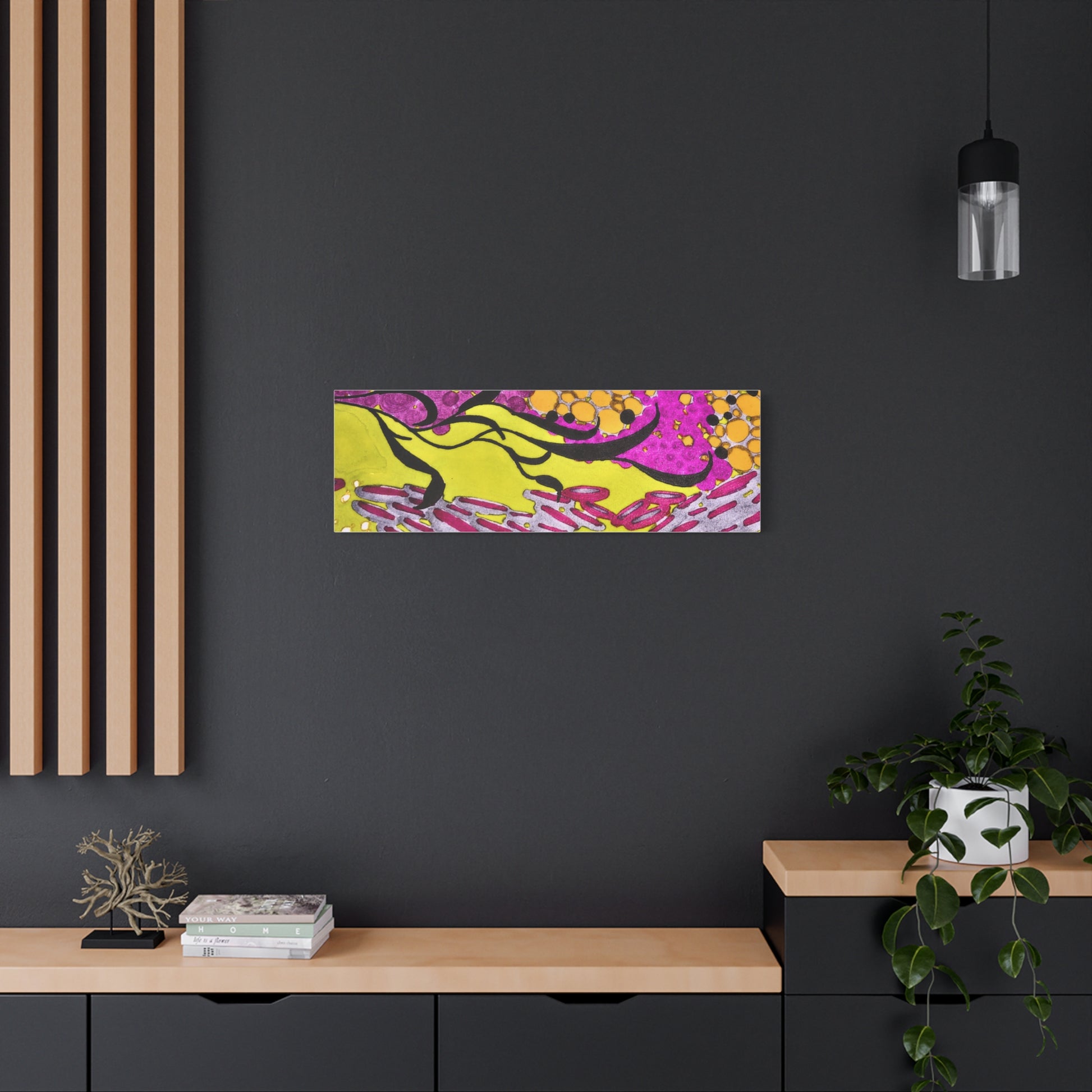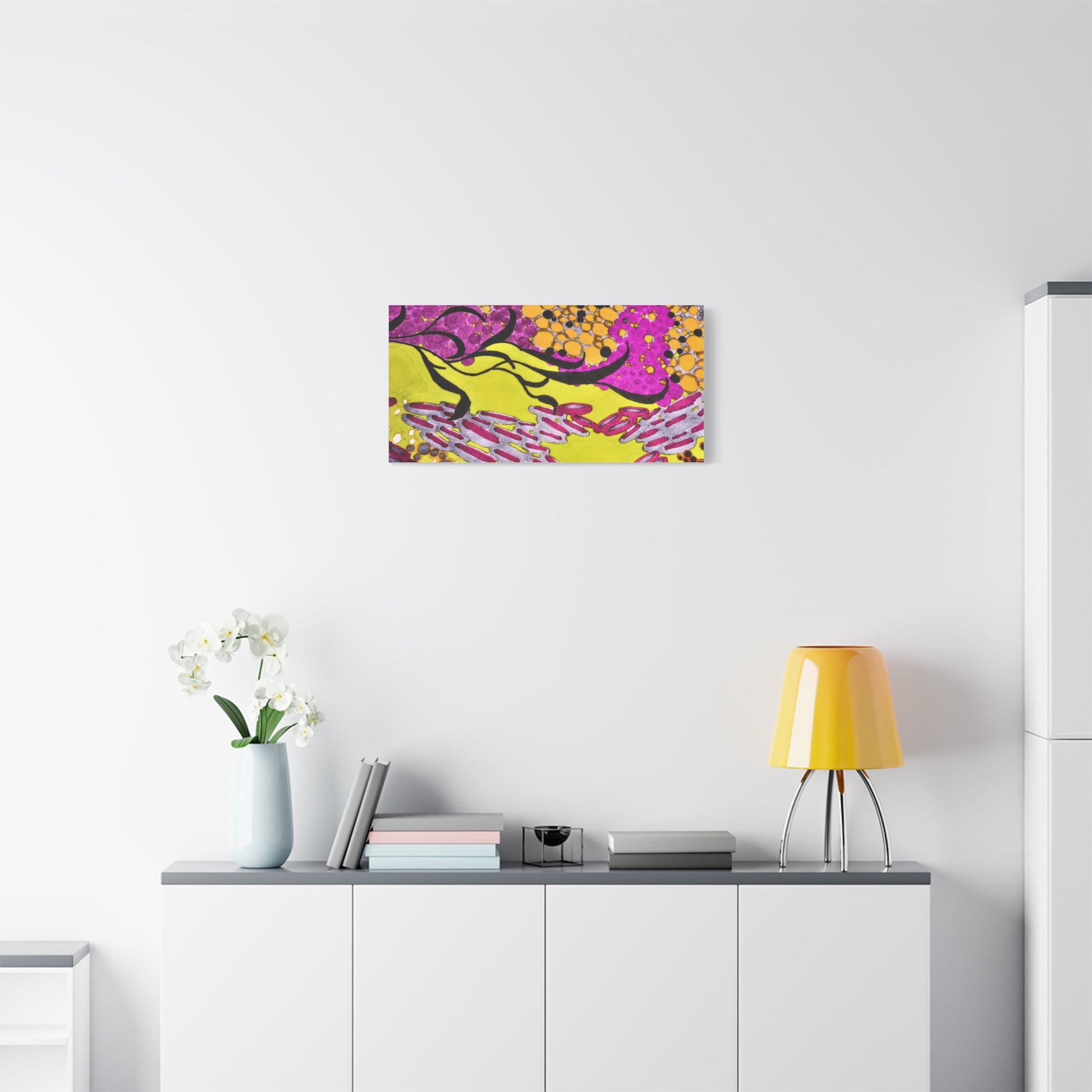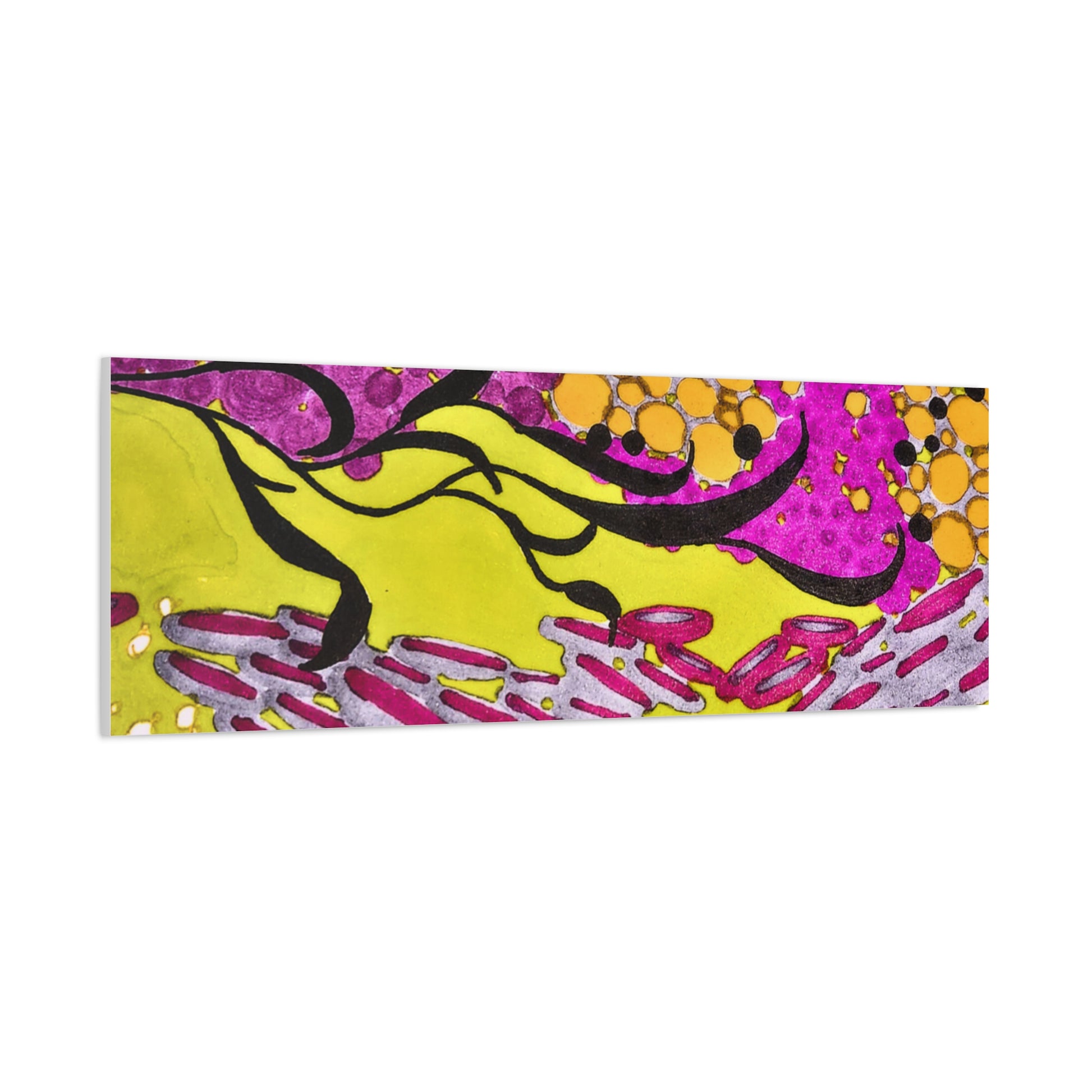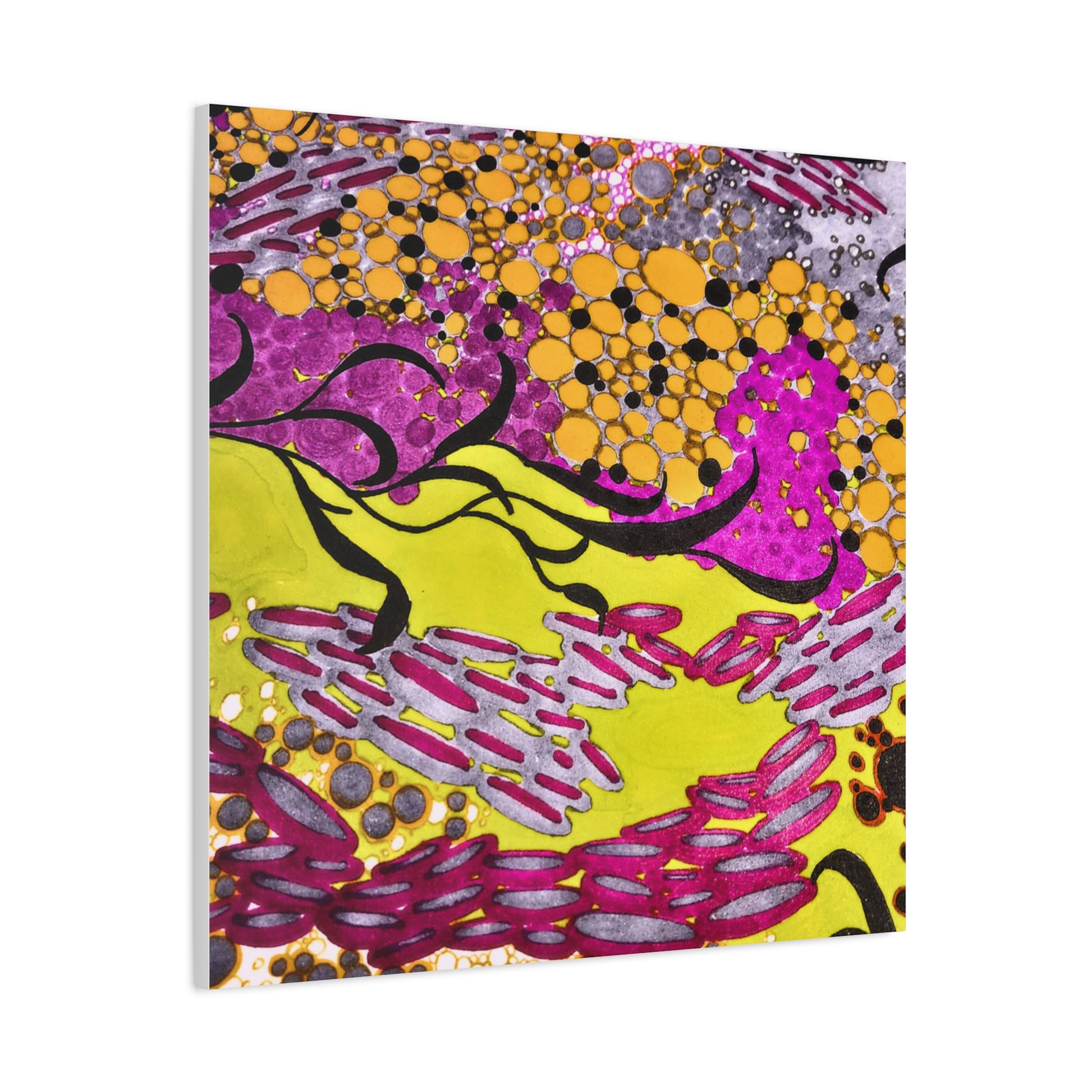 A vibrant stretched canvas that brings an energetic splash of color to any room. Bright lemon yellow fields ripple beneath magenta and plum accents, while pools of amber and graphite dots create movement and depth. The matte finish softens glare and invites close-up discovery — brush-like strokes and layered dots reveal more texture the longer you look. Lightweight but sturdy, this giclée-style canvas hangs flush against the wall and adds an immediate sense of play and creativity to studios, living rooms, or entryways. It reads as both contemporary abstract and joyful patterning, a piece that sparks conversation and lifts the mood of a space.