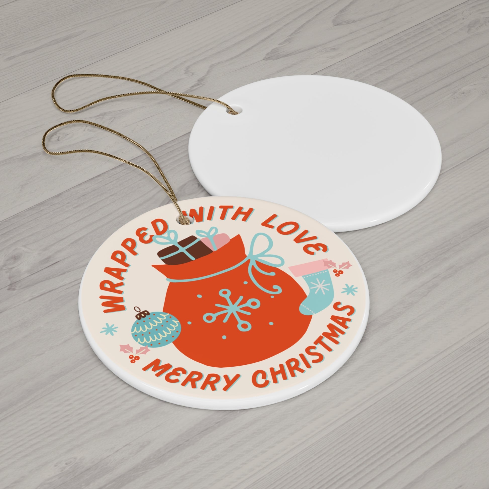Soft-gloss ceramic ornament that brings warm, handmade charm to holiday décor. The single-sided, full-color print shows a cheerful sack of gifts, playful winter accents, and the message “Wrapped With Love — Merry Christmas.” Lightweight but sturdy 3mm ceramic with a glossy sheen makes the colors pop. Each piece arrives ready to hang with a gold-toned string threaded through a pre-drilled hole. Tuck it into a card, hang it on a branch, or add it to a memory-filled tree — it feels like a small, joyful moment you can return to every season.