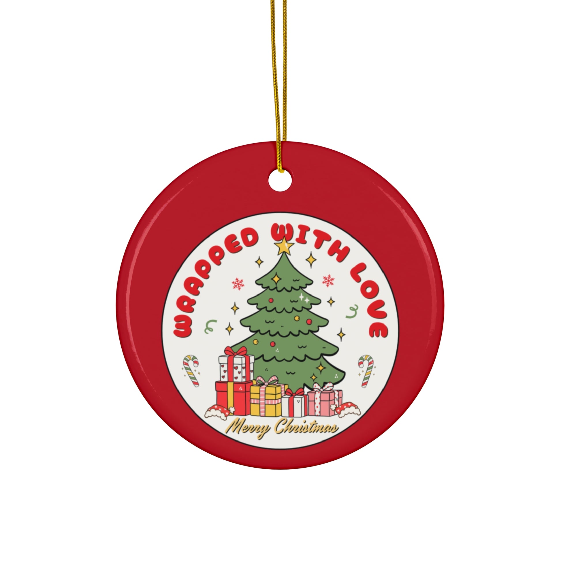Handmade-feel ceramic ornament that brings bright, cheerful color to holiday decor. The glossy, one-sided print shows a festive tree surrounded by gifts and candy canes with the warm message “Wrapped With Love.” Lightweight yet sturdy 3mm ceramic holds crisp detail and a mirror-bright sheen. Each piece comes with a gold-toned hanging string threaded through a pre-drilled hole. Hung on a branch, mantel, or package, this ornament adds a cozy, nostalgic touch that reads like a handwritten holiday note.